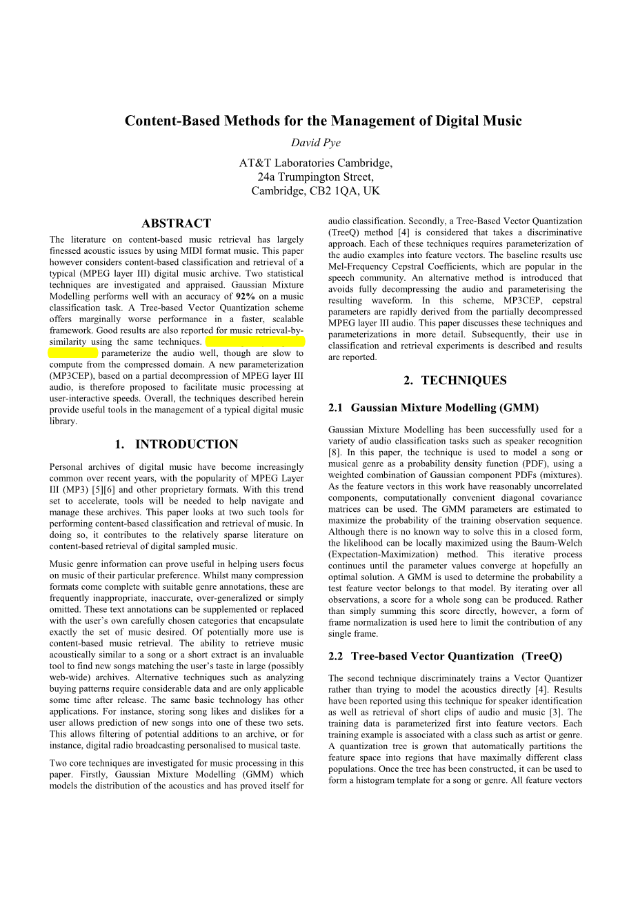 文献题目:Content-Based Methods for the Management of Digital Music