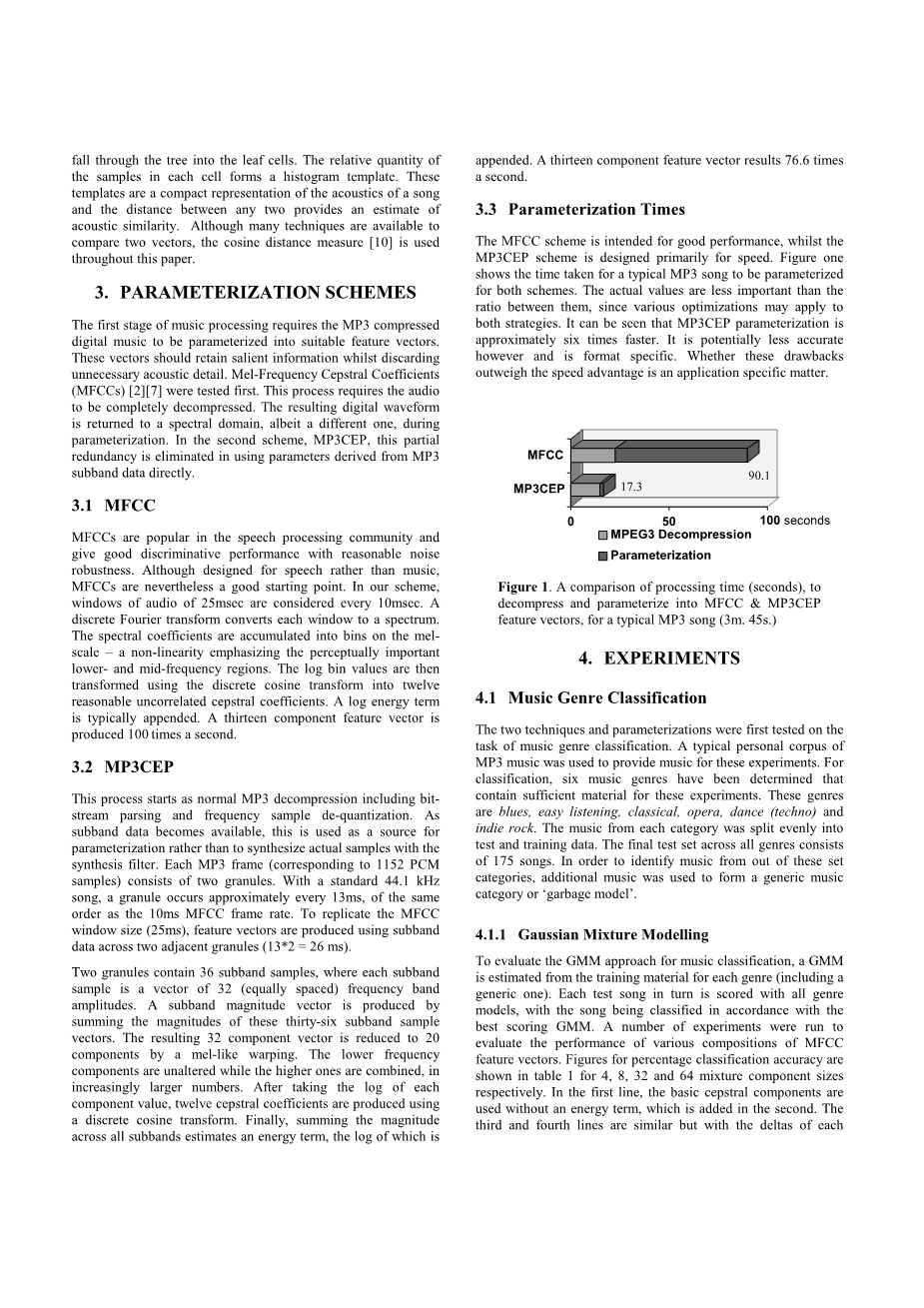 在这篇论文中,有两种核心技术将应用于音乐处理。首先,高斯混合模型将会对声道分布建立模型并用于音频分类。其次,一个基于树型结构的矢量量化方案被认为是一种非常有识别力的方法。这两种方法都需要对音频样例进行参数化成为特征矢量。我们所拥有的基准结果也都是运用了MFCC参数化的结果,这种参数方法在语言社区中非常常见。我们运用了一种可实现的方法来避免音频完全失真同时对实验波形进行参数化。在这种方案下,MP3CEP这种多维倒谱参数将很快从MP3格式的音频中产生。这篇论文详细地讨论了这些技术以及参数设定。最后,这些技术都将会被用于分类以及检索的实验中。