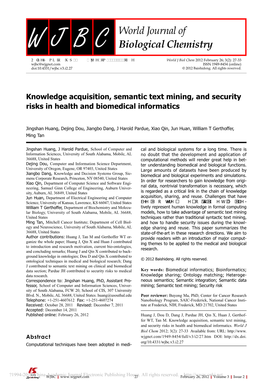 黄景山,窦德静,党江波,J Harold Pardue,秦晓,宦军,William T Gerthoffer,谭明知识获取,语义文本挖掘,以及健康和生物医学信息中的安全风险。World j biol chem 2012;3(2):27-33,可查阅网址:http://www.wjgnet.com/1949-8454/Full/v3/i2/27.htm doi:http://dx.doorg/10.4331/wjbc.v3.i2.27