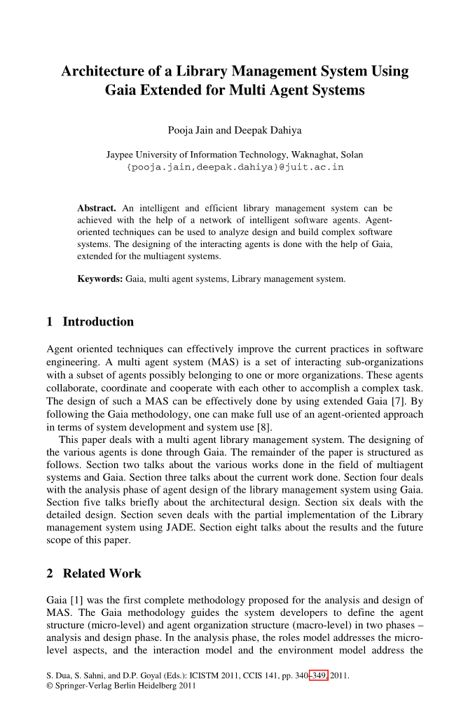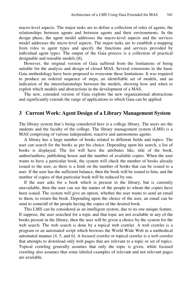 本文主要来处理一个多代理的图书馆管理系统。通过盖亚设计不同的代理。本文的其余部分的结构如下。第二部分谈到了各种工作领域的多重代理系统。第三节讨论当前的工作。第四部分的分析阶段使用盖亚代理设计的图书馆管理系统。第五节简要谈论建筑设计。第六节处理详细设计。第七节处理部分实现图书馆管理系统。第八节谈到未来结果和本文的范围。