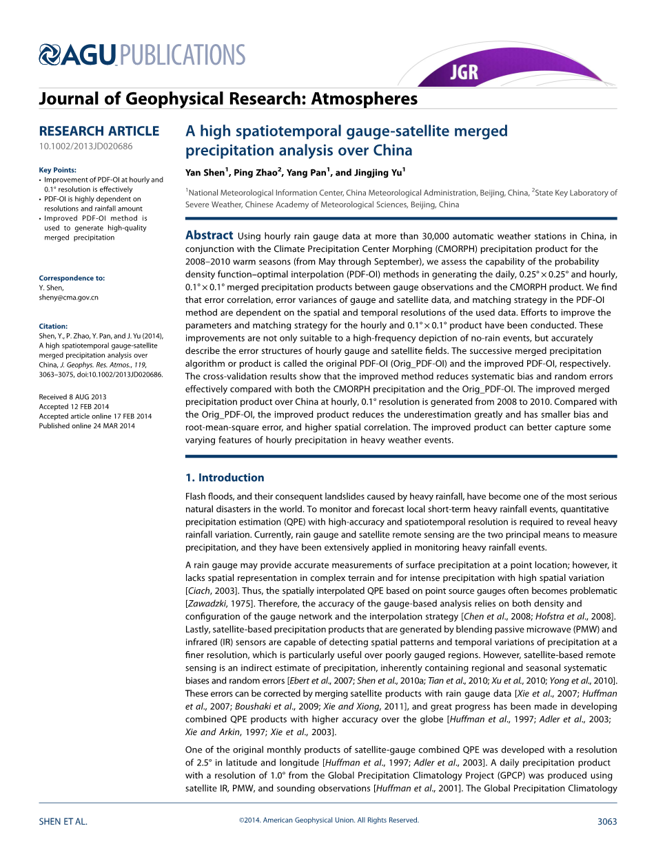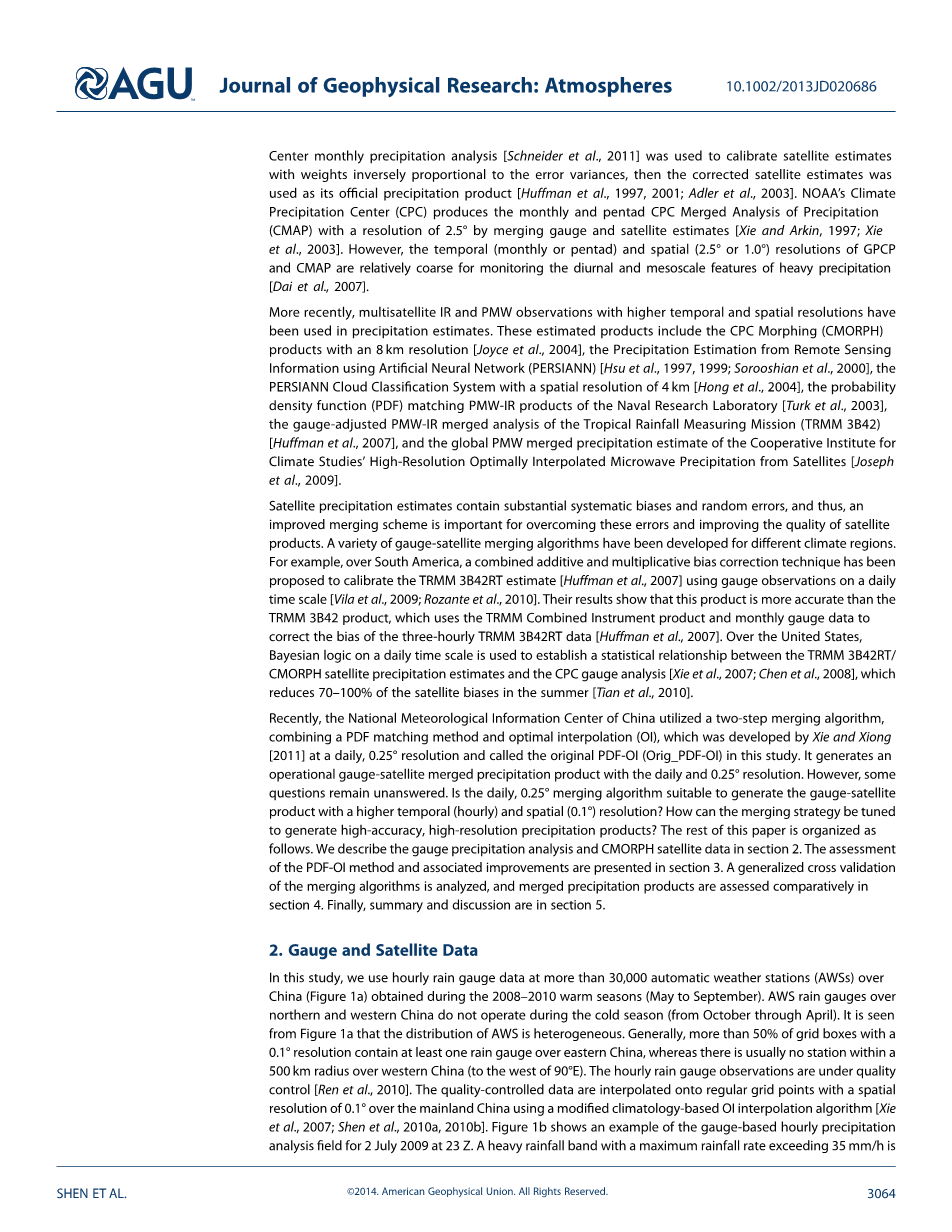 雨量计可以提供对点位置的地面降水的精确测量;然而,它在复杂地形以及具有高空间变异性的强降水中缺乏空间表示[Ciach,2003]。因此,基于站点观测进行空间插值的QPE经常存在问题[Zawadzki,1975]。常规观测分析的精度不仅依赖于观测网络的密度和配置也依赖于插值策略[Chen et al., 2008; Hofstra et al., 2008]。最后,通过混合无源微波(PMW)和红外线(IR)传感器产生的基于卫星的降水产品能够以更精细的分辨率检测降水的空间模式和时间变化,这对于测量较差的区域特别有用。然而,卫星遥感间接估计降水量,本身包含区域性和季节性的系统偏差和随机误差[Ebert et al., 2007; Shen et al., 2010a; Tian et al., 2010; Xu et al., 2010; Yong et al., 2010]。通过将卫星产品与雨量计数据进行融合,可以纠正这些误差[Xie et al., 2007; Huffman et al., 2007; Boushaki et al., 2009; Xie and Xiong, 2011],并在开发全球高精度组合QPE产品方面取得了巨大进展[Huffman et al., 1997; Adler et al., 2003;Xie and Arkin, 1997; Xie et al., 2003]。