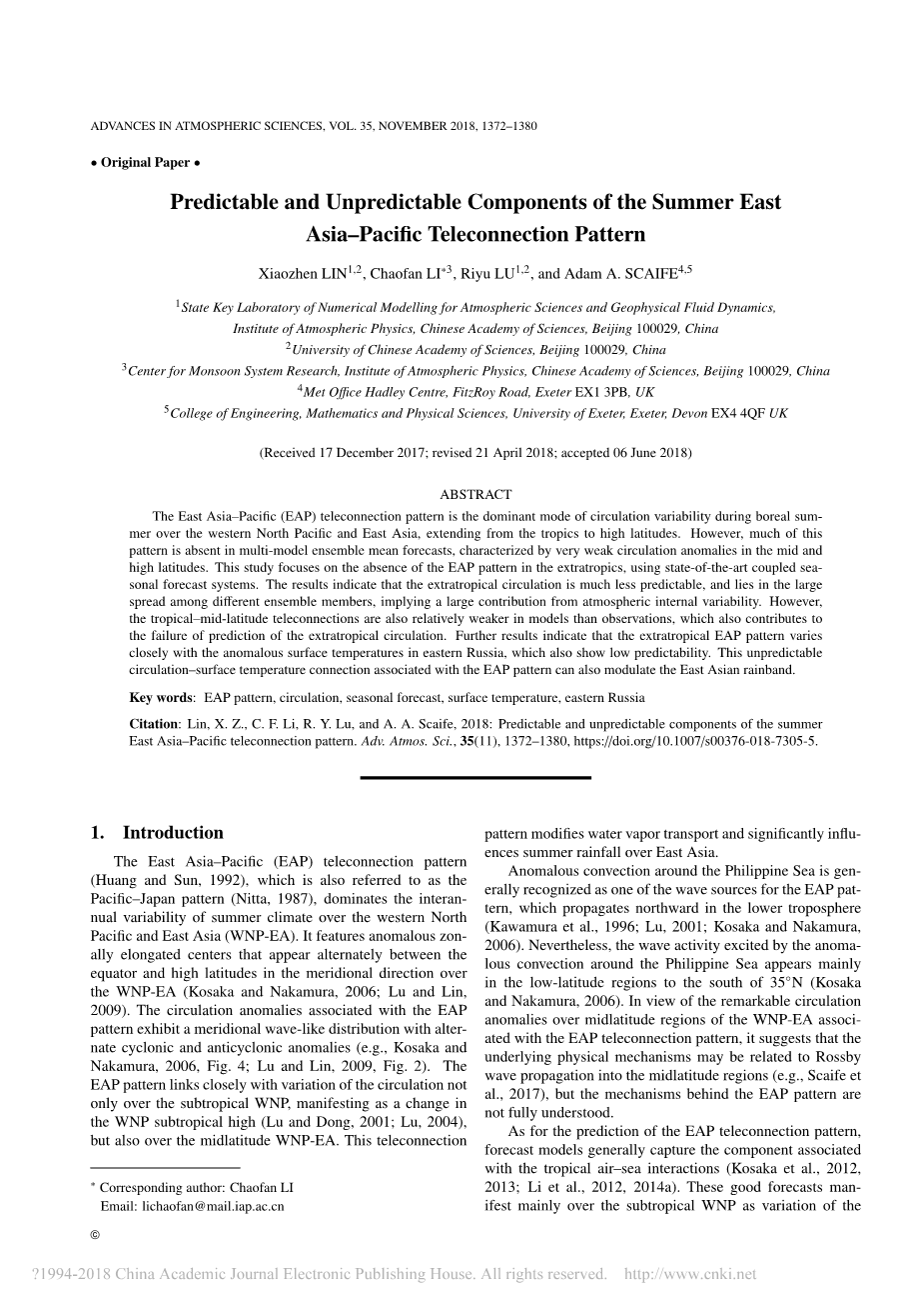 东亚-太平洋(EAP)遥相关型是北半球夏季西北太平洋和东亚地区环流变化的主要模式,它能从热带地区延伸到高纬度地区。然而,在多模式集合平均预测中缺少了这种模式的大部分内容,其特征在于中高纬度存在非常弱的环流异常。本研究利用最先进的耦合海洋预报系统关注温带地区EAP型的缺失。结果表明,温带环流的可预测性要小得多,且取决于不同集合成员之间的大范围扩散。这意味着大气内部变异的贡献很大。然而,热带-中纬度遥相关在模型中也比观测相对要弱,这也导致预测温带循坏的失败。进一步研究结果表明,温带EAP型与俄罗斯东部的异常表面温度密切相关,且也表现出较低的可预测性。这种不可预测的循环—表面温度的联系与EAP型相关,且也可以调节东亚雨带。