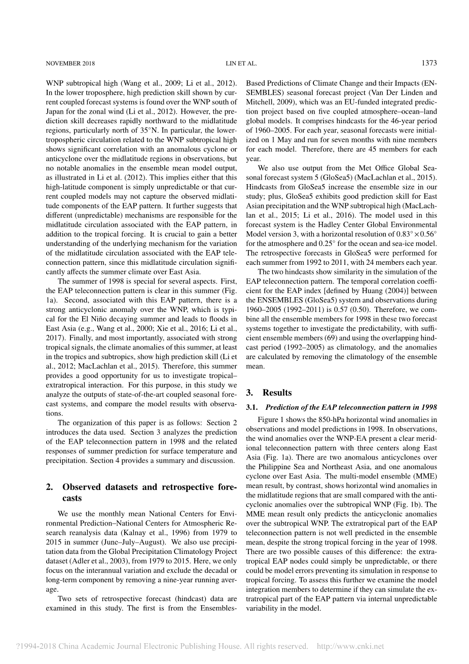 1998年的夏季在几个方面都很特别。首先,EAP遥相关型在这一年的夏季很明显(图1a)。其次,与此EAP型相关,在北太平洋西部存在一个异常强烈的反气旋,这是厄尔尼诺衰变夏季的典型特征,并且这也导致东亚出现洪涝灾害(例如,Wang等,2000; Xie等,2016; Li等,2017)。最后,也是最重要的是,至少在热带和亚热带,这一年夏季与强烈的热带信号有关的气候异常显示出很高的预测能力(Li等,2012; MacLachlan等,2015)。因此,这一年的夏季为我们提供了一个研究热带—温带相互作用的好机会。为此,我们分析了最先进的耦合季节预报系统的输出结果,并将模型结果与观测结果进行了比较。