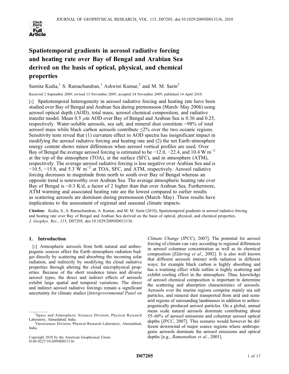 [1]利用气溶胶的光学厚度(AOD),总质量,气溶胶化学成分和辐射传输模型,对季风前(2006年3月至5月)孟加拉湾和阿拉伯海的气溶胶辐射强迫和加热率的时空异质性进行研究。孟加拉湾和阿拉伯海的平均0.5毫米AOD分别为0.36和0.25。水溶性气溶胶,海盐和矿物粉尘占总气溶胶质量的约98%,而黑碳气溶胶占两个海洋区域总气溶胶质量的2%以下。敏感性实验测试表明:(1)AOD光谱中的曲率效应对气溶胶辐射强迫的改变和加热率没有显着影响;(2)当使用气溶胶垂直剖面时,地球-大气能量含量有微小差异。在孟加拉湾上空,大气顶部(TOA),地表(SFC)和大气层(ATM)的平均气溶胶强迫分别约为-12.0 W·m-2,-22.4 W·m-2和10.4W·m-2。平均气溶胶辐射对阿拉伯海的负强迫较小,TOA,SFC和ATM分别为-10.5 W·m-2,-15.8 W·m-2和5.3W·m-2。值得注意的是气溶胶辐射强迫在孟加拉湾上空从北向南逐渐减小,而在阿拉伯海上则相反的趋势。孟加拉湾的平均大气加热率为~0.3K/d,比阿拉伯的加热率海高2倍。此外,与早期结果相比,ATM的升温和相关的加热率最低,因为在季风前(3月至5月),散射气溶胶占据主导地位。这些结果对区域和季节气候影响的评估有重要影响。