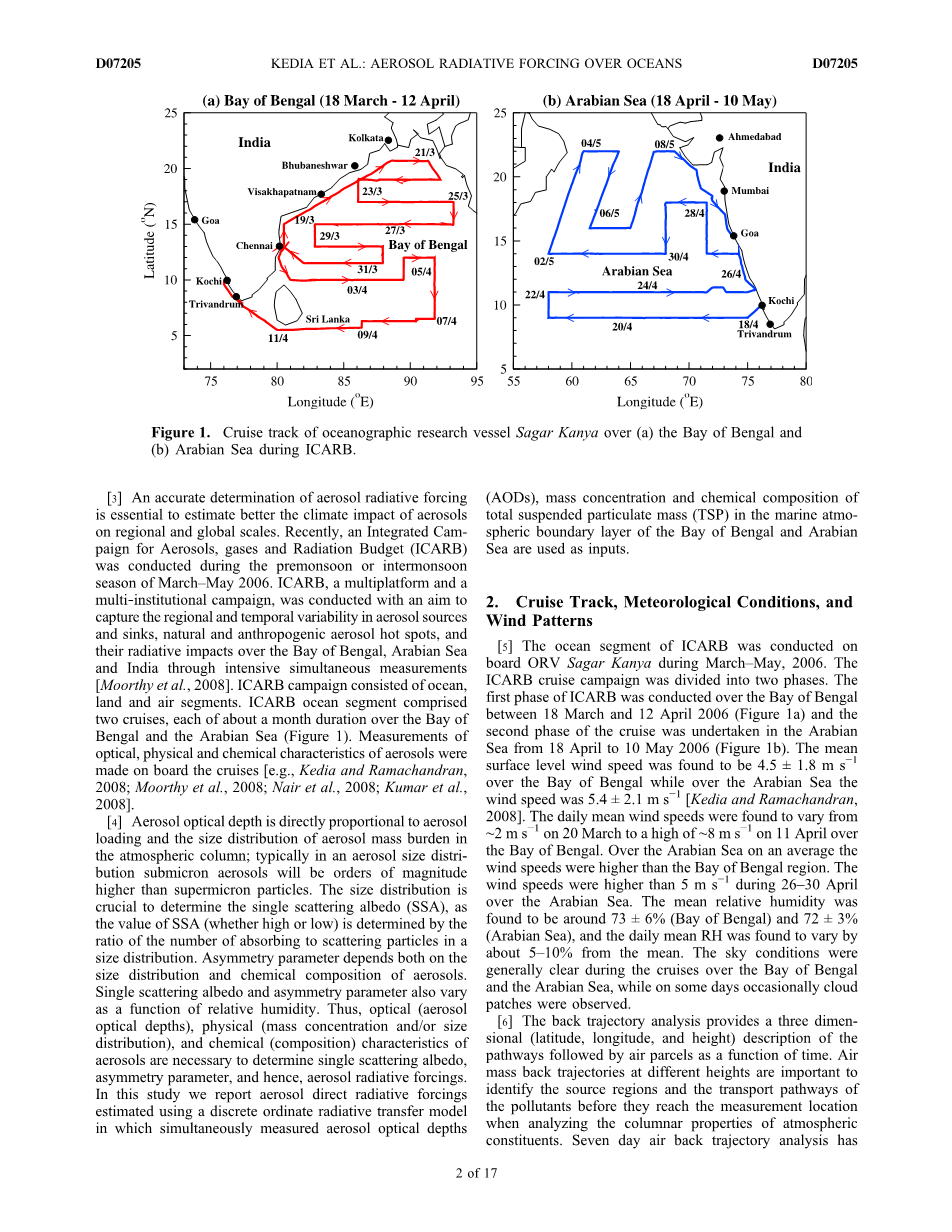 [3]准确确定气溶胶辐射强迫对于气溶胶对区域和全球尺度的气候影响的估算至关重要。最近,在2006年3月至5月的季前或季风季节期间开展了气溶胶、气体和辐射收支完整运动(ICARB)。ICARB是一个多平台和多机构运动,目的是捕捉地球和气候变化的气源和汇,通过密集的同时测量,自然和人为气溶胶热点及其对孟加拉湾,阿拉伯海和印度的辐射影响[Moorthy等,2008]。 ICARB运动包括海洋、陆地和空中部分。 ICARB海洋段包括两次巡航,每次巡航大约持续一个月在孟加拉湾和阿拉伯海上航行(图1)。气溶胶的光学,物理和化学特性的测量是在巡航上进行的[Kedia and Ramachandran,2008; Moorthy等,2008; Nair等,2008; Kumar等,2008]。