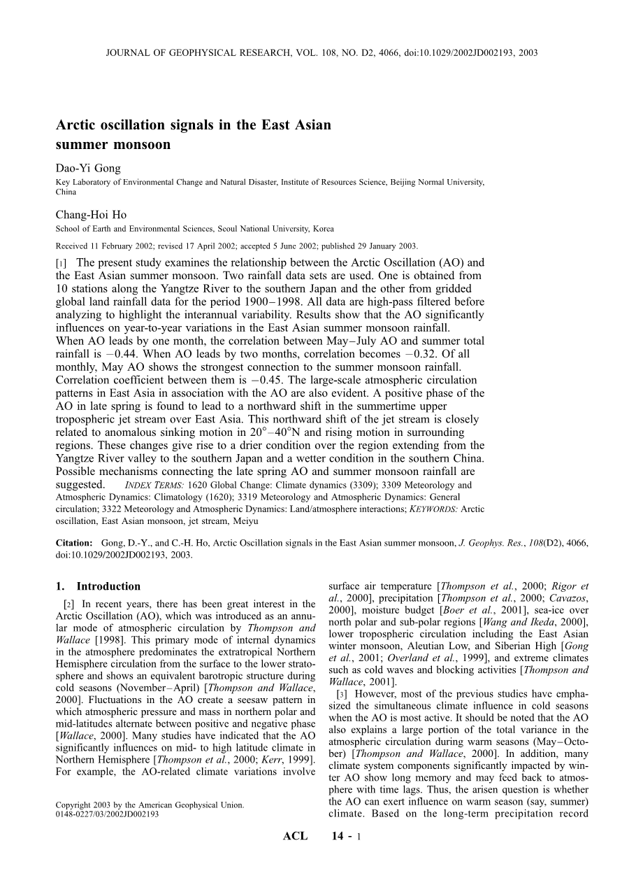 引文Gong, D.-Y.和C.-H. Ho,东亚夏季风的北极涛动信号,地球物理学报。