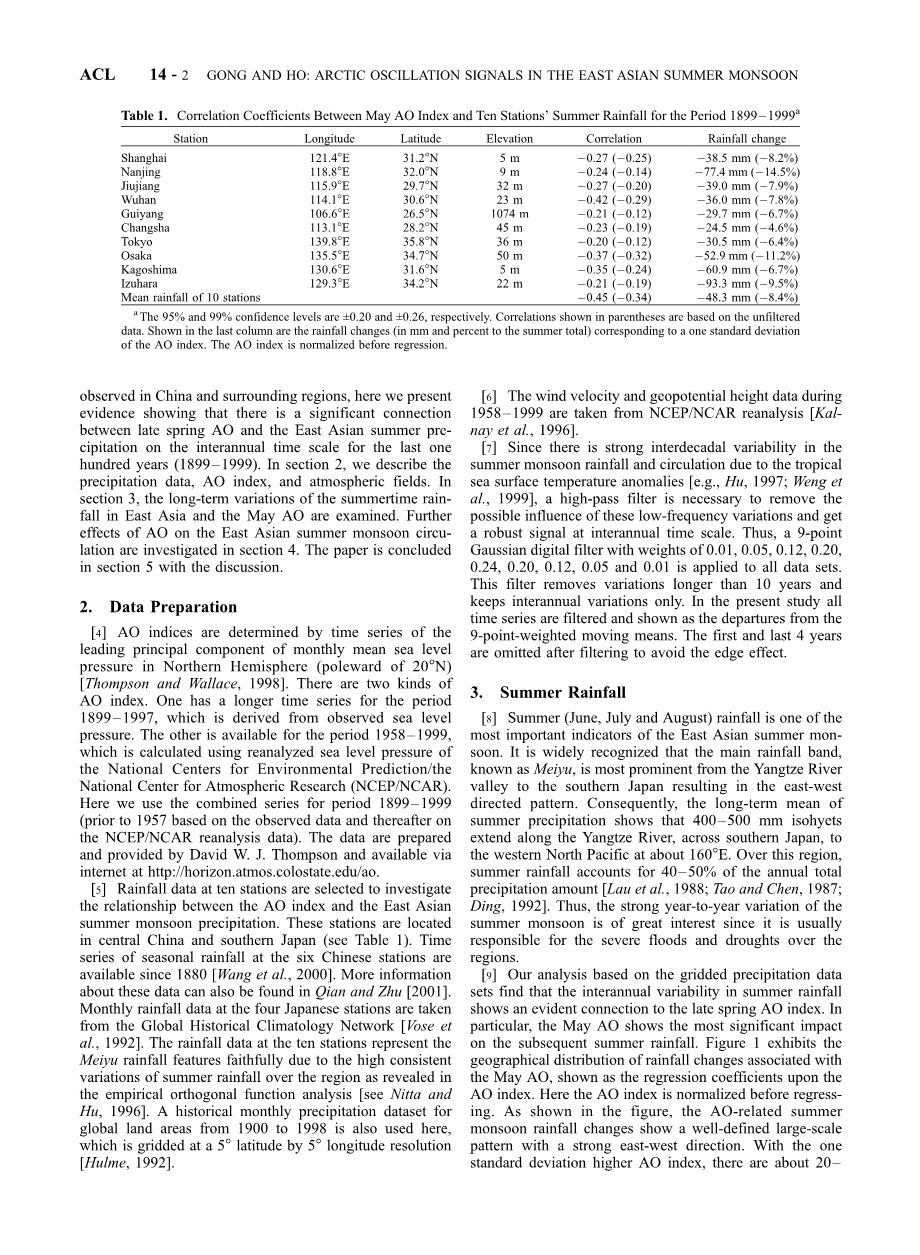[3] 然而,当AO最活跃时,以往的大多数研究都强调在寒冷的冬季同时发生的气候影响。值得注意的是,AO也解释了温暖季节(5-10月)大气环流的大部分变化[Thompson and Wallace, 2000]。此外,许多受冬季AO影响显著的气候系统成分具有较长的记忆性,并可能随着时间的滞后而反馈到大气中。因此,出现的问题是AO是否会对暖季(如夏季)气候产生影响。根据我们提供的中国及周边地区长期降水记录,在过去一百年(1899-1999)的年际时间尺度上,晚春AO与东亚夏季降水存在显著的相关性。在第二节中,我们描述了降水数据、AO指数和大气场。在第三节中,利用东亚五月夏季降水的长期变化检验AO。第四节中,研究AO对东亚夏季风环流的进一步影响。第五节则是本文的结论和讨论。