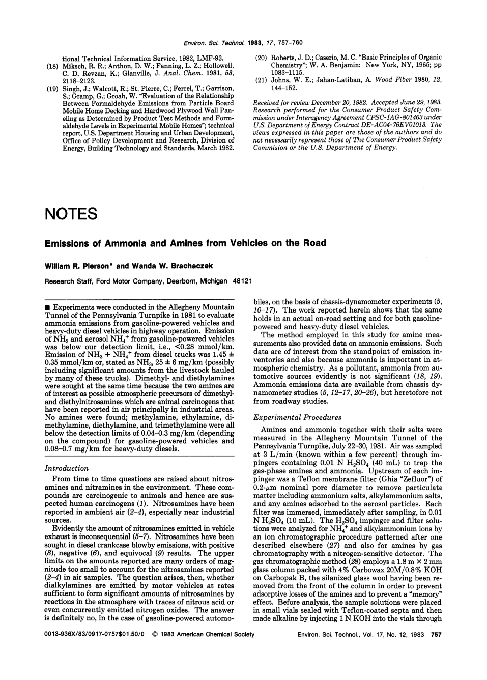 有时在环境中提出有关亚硝胺和硝胺的问题,这些化合物对动物致癌,因此被怀疑是人类的致癌物质。(1)亚硝胺已经在环境空气中报道(2-4),特别是在工业来源附近。显然车辆中排出的亚硝胺的量排气是无关紧要的(5-7)。在柴油曲轴箱排气中已经找到亚硝胺,有肯定的结果(8),否定的结果(6)和不确定的结果(9)。所报告的量的上限是许多太小的数量级,而无法证明空气样品中报告的亚硝胺(2-4)。那么问题就在于,二氧化胺是否由汽车以足以通过大气中亚硝酸或甚至同时排放的氮氧化物的反应形成大量亚硝胺的速率排放。在汽油动力汽车的情况下,在底盘测力计实验的基础上,答案绝对是:否(5,10-17)。本文报告的工作表明,在实际的道路环境以及轻型柴油车和重型柴油车辆中也是如此。