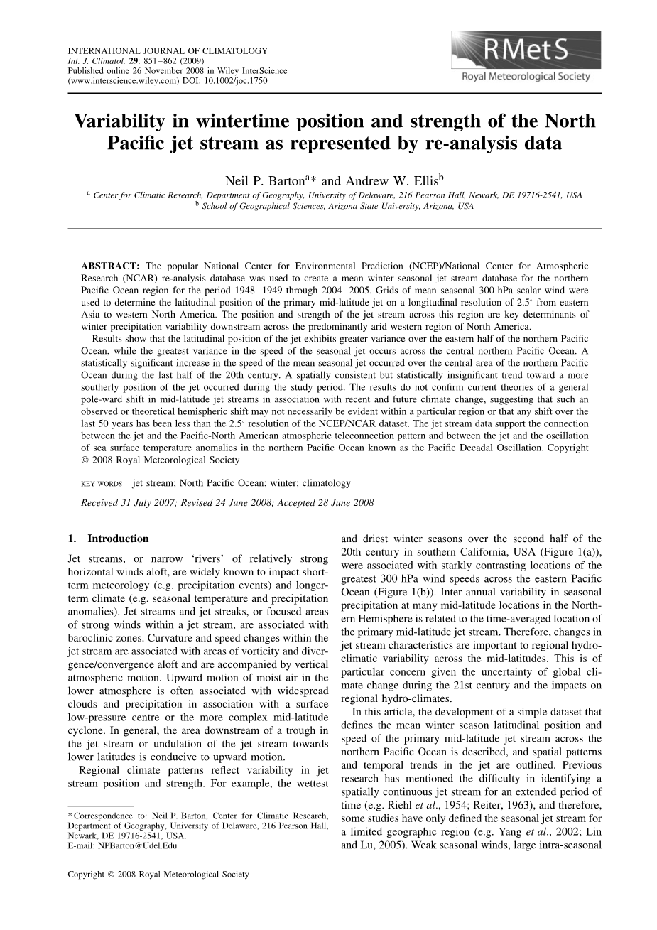 在本研究中,我们以经纬度2.5°的分辨率来确定冬季北太平洋急流的平均速度与纬向位置。因为冬季急流相对强度较大,与Yang et al. (2002)类似,我们着重于冬季平均。北半球中纬度冬季往往与急流驱动的高频天气尺度风暴相联系。我们主要的研究兴趣在于建立一个将急流和北美西部季节性降水形态相关联的急流位置与强度气候平均。急流动力学和单独降水事件之间的联系已经广为人知很多年了(e.g. Riehl et al., 1954; Reiter, 1963),但对于季节性降水的研究兴趣让我们尝试确定平均季节性急流。