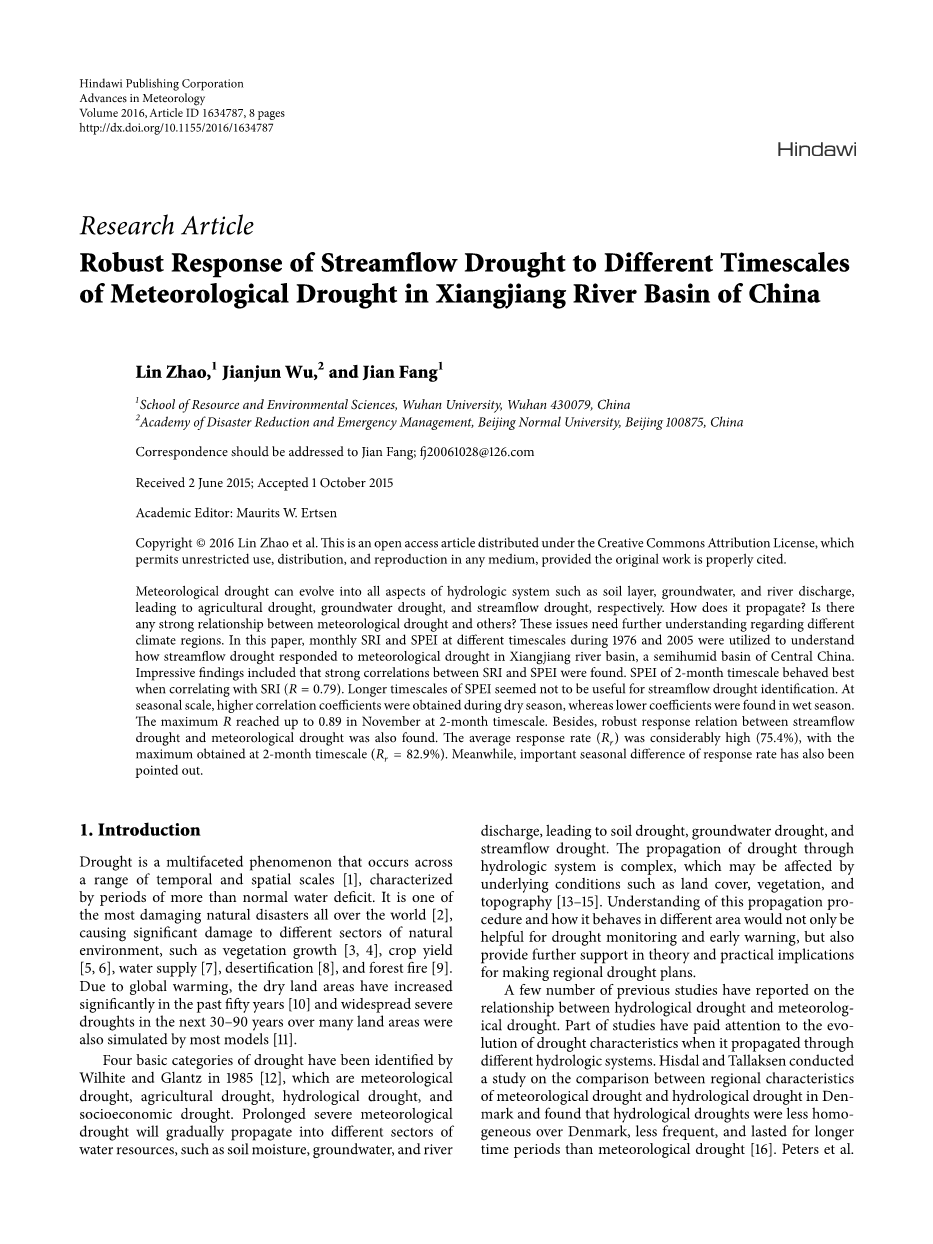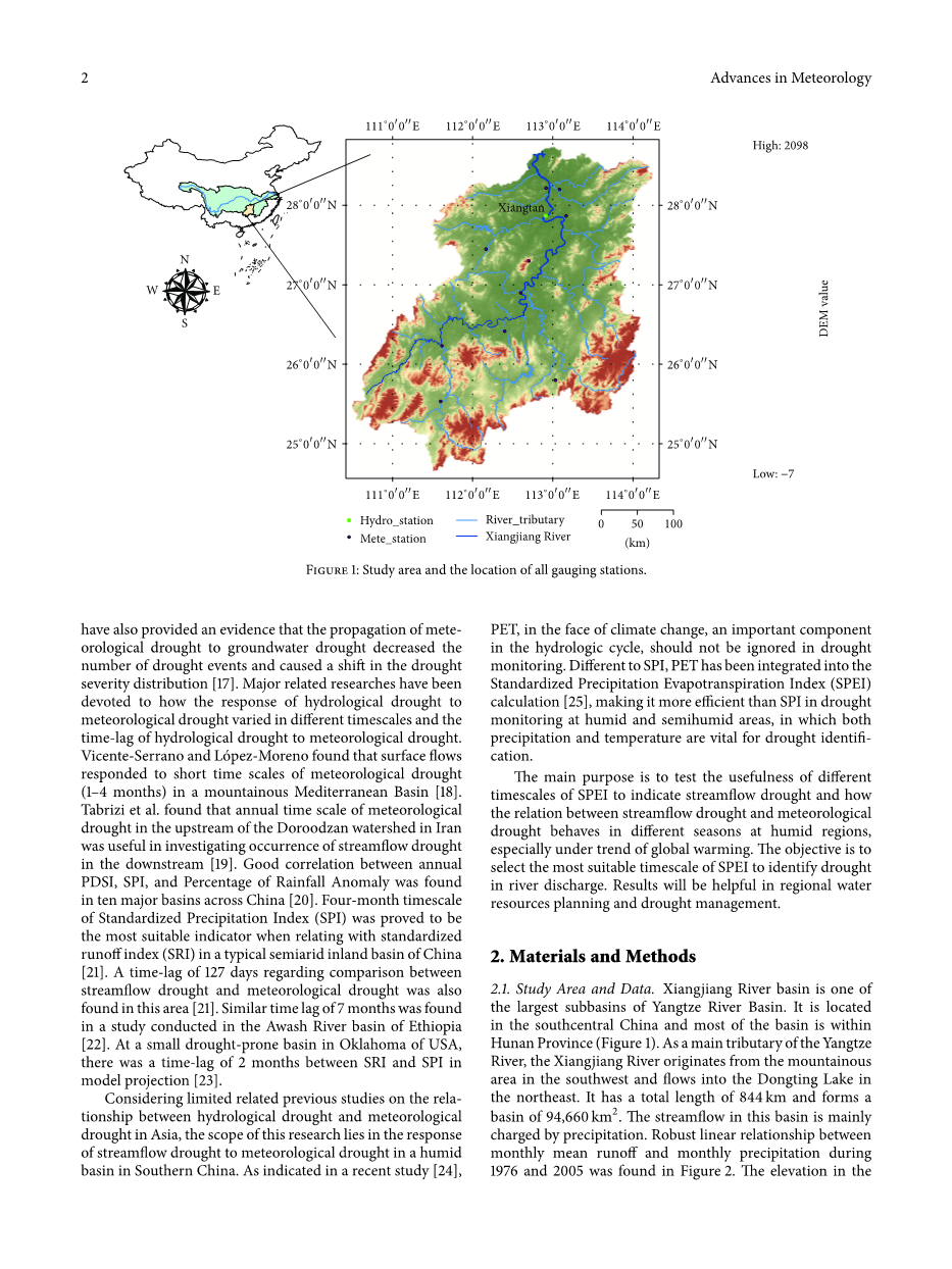 几个以前的研究报道了水文干旱与气象的关系干旱。部分研究已经注意到当干旱通过不同水文系统传播时的进一步的特征。在丹麦,Hisdal和Tallaksen进行了一个比较气象干旱与水文干旱区域特征的研究,并发现,与气象干旱相比,水文干旱分布较不均匀,发生频率较小,并且持续更长的时间[16]。 Peters等人还提供了证据表明,由气象干旱向地下水干旱的传播减少了干旱事件的数量,并导致了一个干旱严重程度分布的转变[17]。相关研究主要致力于不同时间尺度的水文干旱对气象干旱如何响应以及水文干旱到气象干旱的时滞。Vicente-Serrano和Lopez-Moreno发现了在多山地中海流域,表面流动回应了气象干旱的短时间尺度(1-4个月)[18]。Tabrizi等人发现在伊朗Doroodzan流域上游的年时间尺度气象干旱适用于调查下游的河流干旱的发生[19]。在中国的十个主要流域[20],年时间尺度下的PDSI,SPI和降雨百分比异常之间具有良好相关性。在中国典型半干旱内陆流域内,四个月时间尺度下的标准化降水指数(SPI)在与标准化径流指数(SRI)[21]相关时最适合用于指标。 在这个区域内[21]同时还发现了河流干旱与气象干旱之间有127天的时间延迟。在埃塞俄比亚的阿瓦什河流域进行的研究[22]也曾发现类似的长达7个月的时间滞后。在美国俄克拉荷马州一个小干旱易发流域,模型投影[23]下在SRI和SPI之间存在2个月的时间滞后。