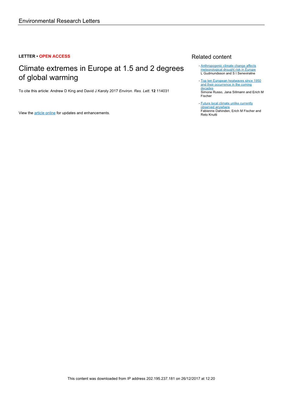 这一研究主要关注欧洲在1.5摄氏度和2摄氏度温升下气候极端状况。欧洲是一个研究相关问题的合适全区域,因为它深受部分与人为气候变化有关的气候极端现象的影响,这种极端现象导致了过多的伤亡、大型经济损失以及其他影响(比如Pall等2011,Mitchell等2016b,Schaller等2016)。大量的研究调查了人为影响气候变化对最近气温(Stott等2004,King等2015a,Uhe等2016)和降水(Yiou和Cattiaux2014,Otto等2015) 极值在不同大陆地区的重要性。由欧洲的气象服务所支持的高质量的数据观测网络,一些产品提取利用了这一数据网络,产品包括E-OBS(Haylock等2008)。这使用来预测在1.5摄氏度和2摄氏度下的气候极值得到更好的预估,提供了优于世界其他地区的结果。