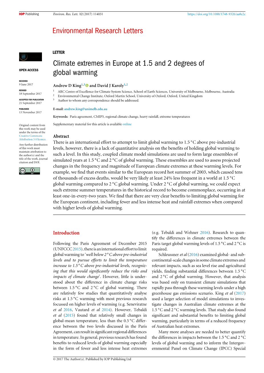 根据2015年12月的《巴黎协定》(2015《联合国气候变化框架公约》),将“2摄氏度温升目标正式纳入大会成果”,并提出“力争把温升控制在较工业化前上升1.5摄氏度以内,认可这将大大减弱气候变化的风险和影响”。然而,目前对1.5摄氏度温升与2摄氏度温升时的气候变化在区别上仍所知尚少。目前针对研究定量分析1.5摄氏度温升的研究较少,而对更高的升温水平的研究更多(比如Seneviratne等2016,Vautard等2014)。但是,Tebaldi等(2015)发现全球平均气温发生了相对小的变化,这种变化小于在两种巴黎协定讨论的两种温升水平下的0.5摄氏度的差异,这种变化能引起重大的区域气温变化。总的来说,目前的调查发现 降低全球变暖的水平,特别是通过更低和更弱的极端温度来降低,是有益的。(比如Tebaldi和Wehner2016)。调查亟需定量分析巴黎协定目标1.5和2摄氏度温升时极端气候差异。
