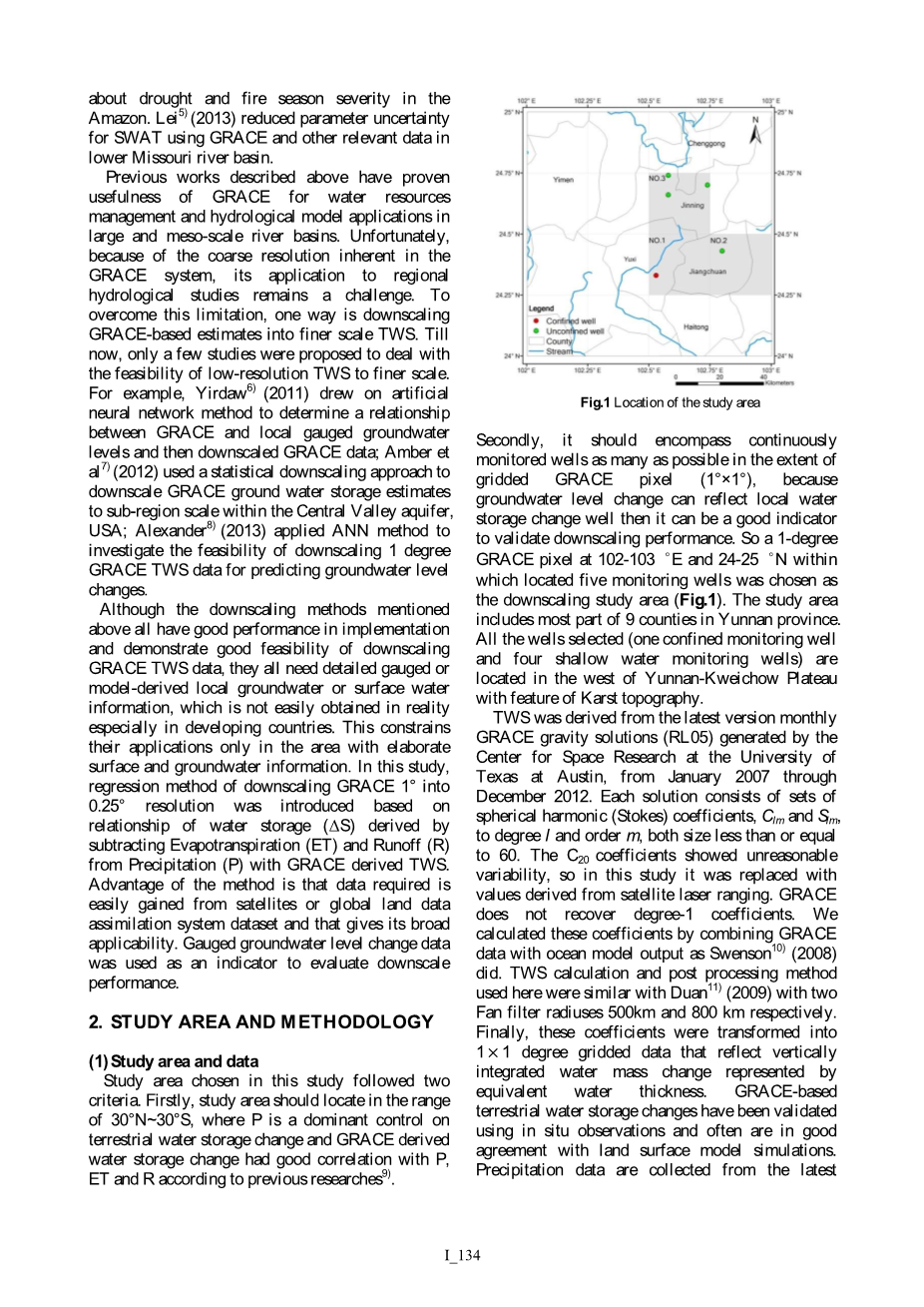 在这项研究中选择研究区域应遵循两个标准。首先,研究区应定位在30°N ~ 30°S的范围,在这个范围,降水P是陆地水储量变化的主导控制因素并且根据以往的研究GRACE反演得到的水储量变化与P,ET,和R有良好的相关性。其次,它应该包含尽可能多的某种程度上网格的GRACE像素为1°times;1°的连续监视井,由于地下水位变化可以反映当地的水储量变化那么地下水位变化就是验证降尺度性能的一个良好指标。所以在102-103︒E和24-25︒N内含五个监测井的GRACE1°的地区被选为降尺度研究区(图1)。研究区包括云南省9个县的大部分地区。所有选定的监测井(一个承压井和四个浅水监测井)位于有喀斯特地貌特征的云南贵州高原的西侧。
