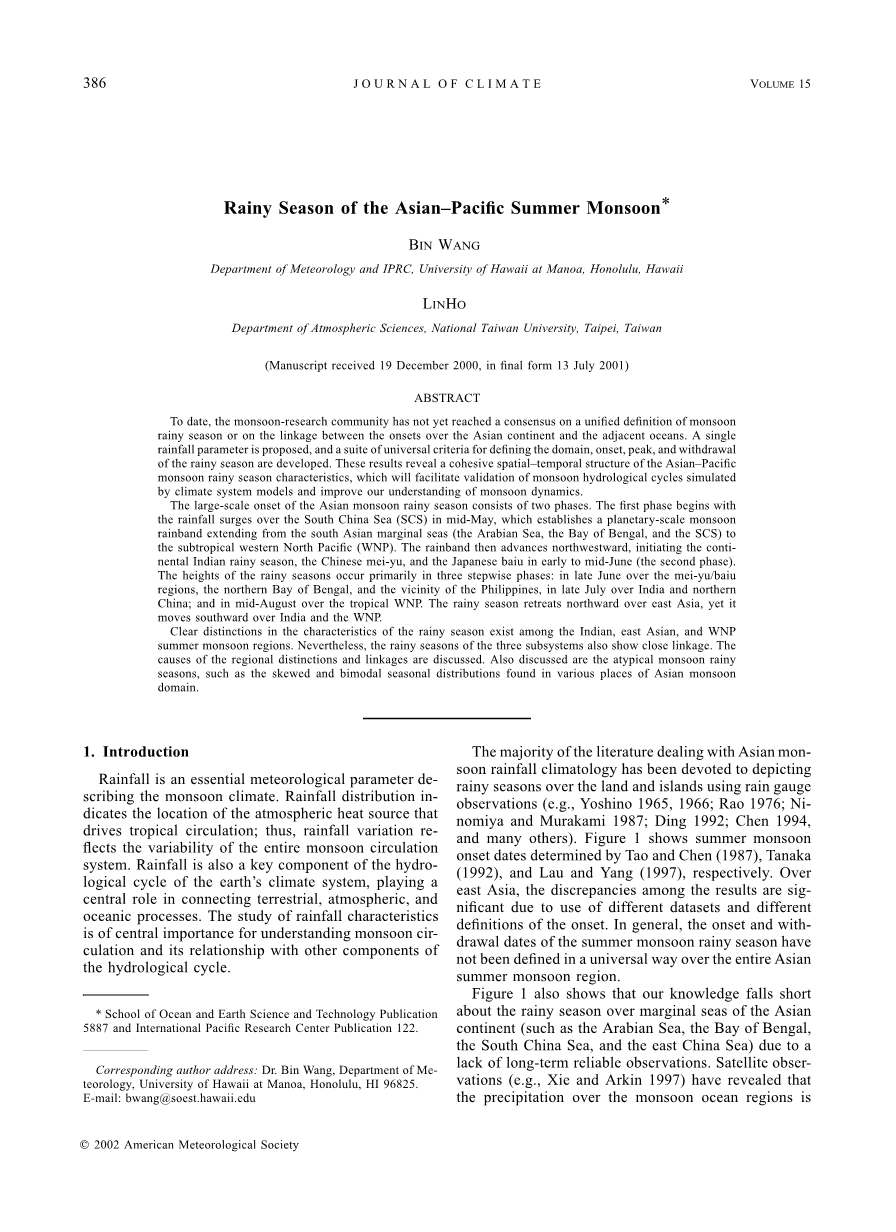 经常被忽视的是热带西北太平洋(WNP)区域(10°-22°N,120°-170°E),但此区恰好显示了典型的季风特征(Murakami和Matsumoto 1994)。虽然WNP上的海洋季风在某些方面与大陆季风不同,例如降水的天气系统,但大陆和海洋季风都由太阳辐射的年变化驱动并由海-陆热力差异控制。因此,它们具有共同的基本特征,即每年内盛行风向有逆转以及多雨夏季和干燥冬季之间能形成强烈对比。无论是从地面风标准(Ramage 1972)还是雨季特征(Wang 1994)来看,WNP区域已被确认为亚太季风区的一部分,然而WNP雨季如何与亚洲夏季风的其他区域相联系却不为人所知。