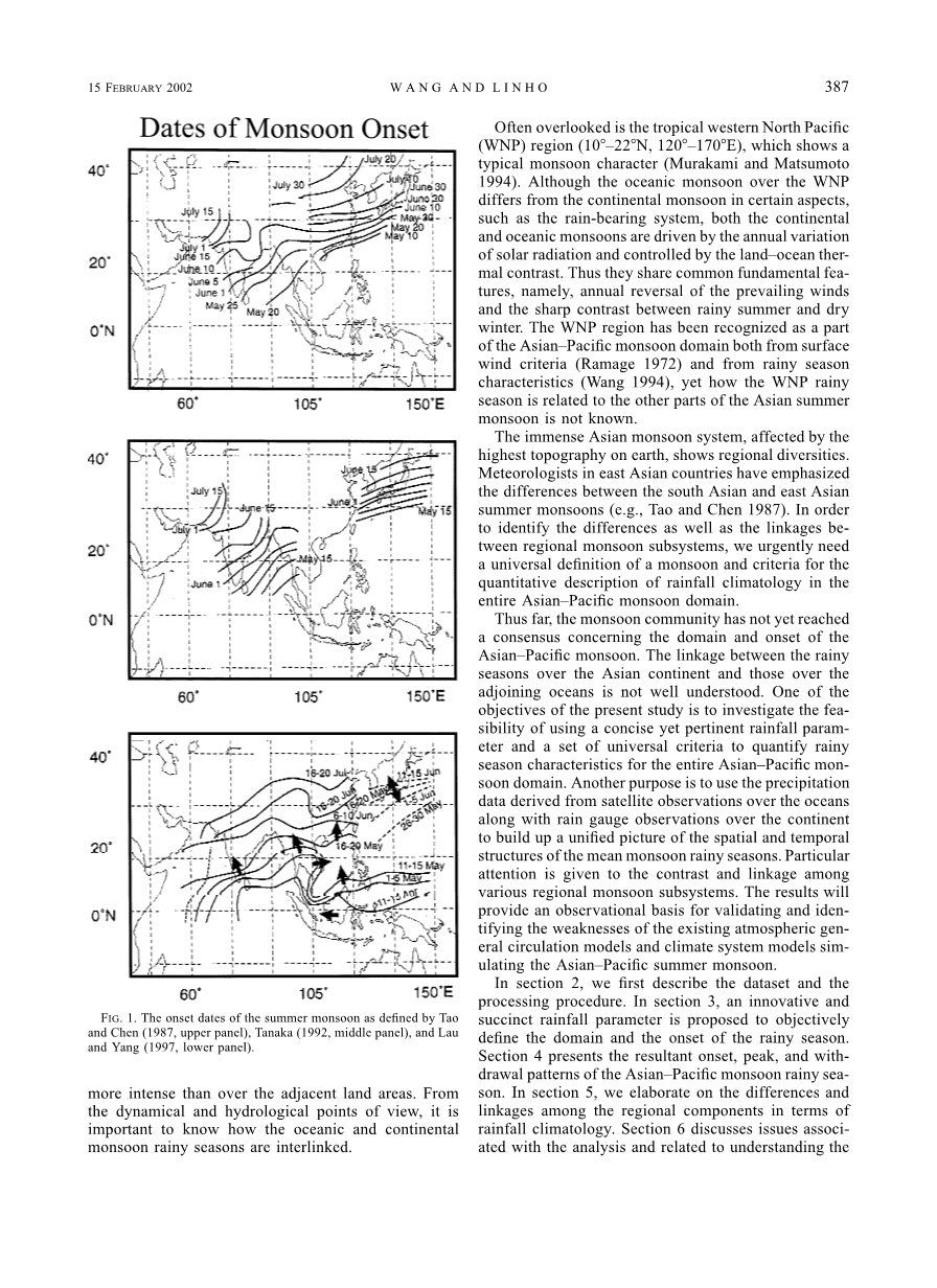 大多数关于亚洲季风降水气候学的文献一直致力于用雨量观测数据来描述陆地和岛屿的雨季(例如,Yoshino 1965,1966;Rao 1976;Ninomiya和Murakami 1987;Ding 1992;陈1994等)。图1显示了分别由Tao和Chen(1987),Tanaka(1992),Lau和Yang(1997)确定的夏季风爆发日期。在东亚,由于使用不同数据和不同的季风爆发定义,各种结果之间存在显著的差异。一般来说,夏季季风雨季的开始和撤退日期在整个亚洲夏季风区域并无普遍定义。