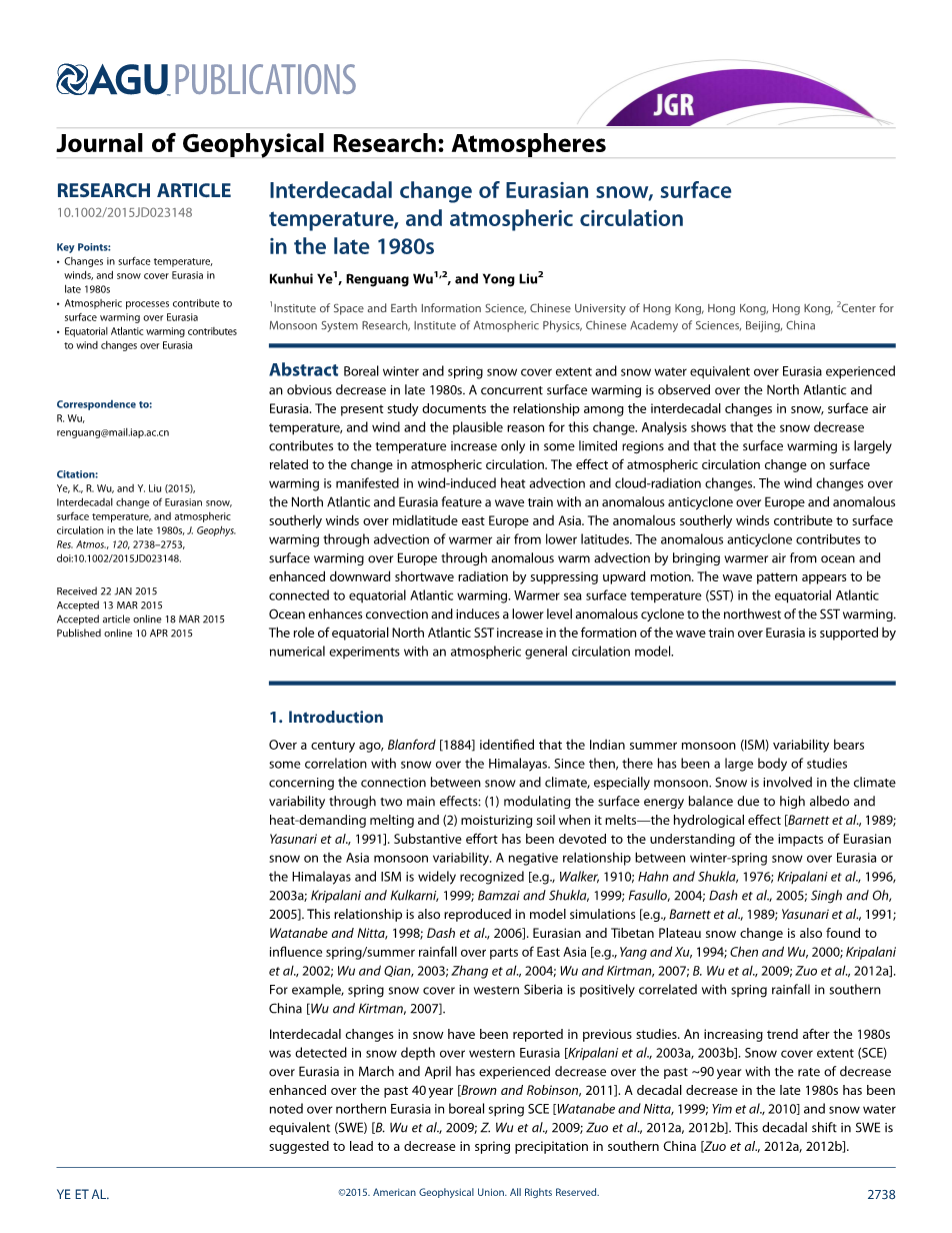 之前的研究表明,积雪存在年代际变化。通过对欧亚西部积雪深度的探测发现,1980S之后积雪呈增加趋势[Kripalani et al.,2003a,2003b]。欧亚地区三月和四月的雪盖面积(SCE)在过去约90年中减少,并且在过去的40年里其减少的速度在不断加快[Brown and Robinson,2011]。在1980s末,欧亚北部春季SCE[Watanabe and Nitta,1999;Yim et al.,2010]与积雪水当量(SWE)[B. Wu et al.,2009;Z. Wu et al.,2009;Zuo et al.,2012a,2012b]均存在年代际增加,这种SWE的年代际转变可以导致中国南部春季降水减少[Zuo et al.,2012a,2012b]。