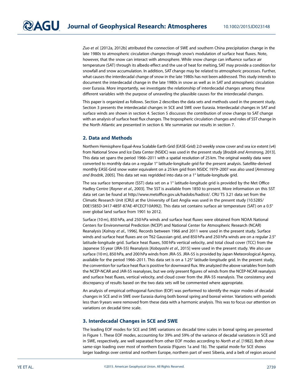 Zuo et al. [2012a,2012b]将SWE与中国南方1980s末降水的变化这二者间的联系归因于通过积雪调制地表热通量进而造成的大气环流的变化。然而值得注意的是,积雪与大气间存在相互作用。在积雪变化通过其反照率效应及融化吸热来影响地表气温(SAT)的同时,SAT也可为降雪和雪的累积提供背景环境。此外,SAT的变化也可能与大气进程存在联系。然而,是什么原因造成1980s末积雪的年代际变化,这一问题还未得到解决。本次研究将证明1980s末欧亚积雪、SAT和大气环流的年代际变化,并探讨这些不同变量年代际变化间的关系,旨在阐明这些年代际变化的可能原因。