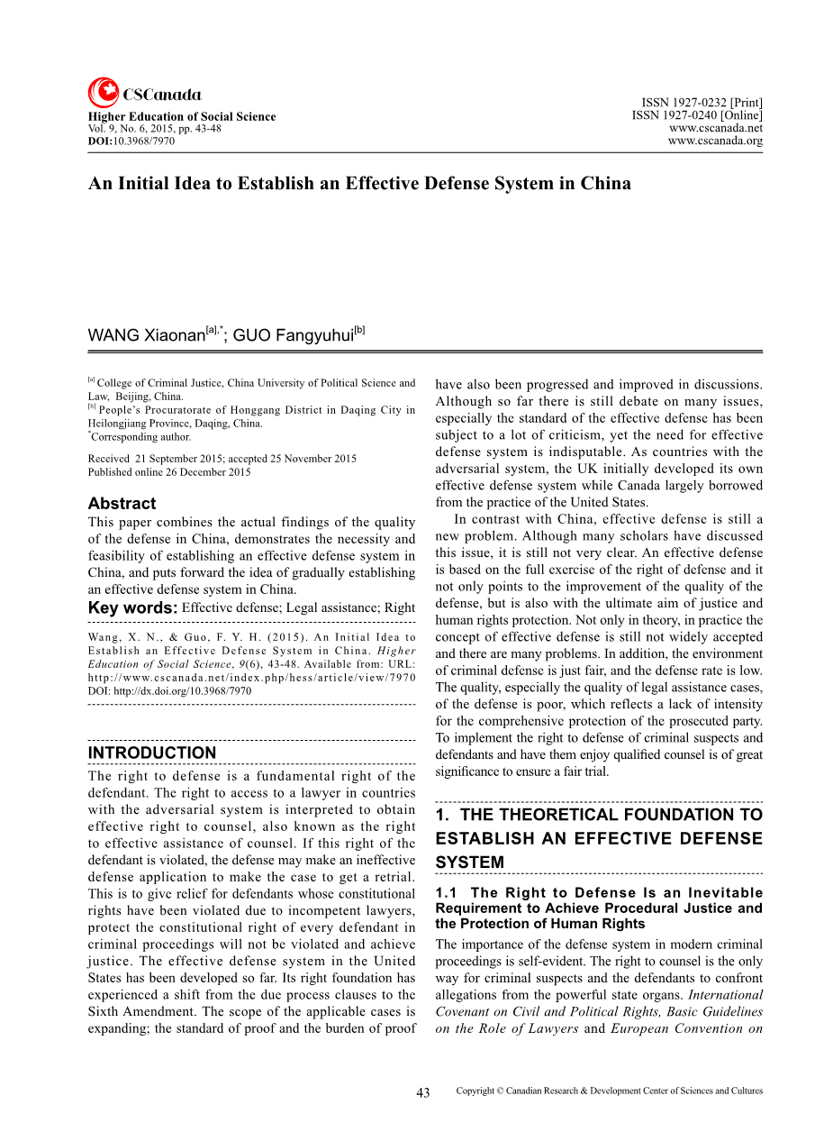 [a]中国政法大学刑事司法学院,北京。 [b]中国大庆黑龙江省大庆市红岗区人民检察院。 *通讯作者。 收到2015年9月21日 接受2015年11月25日在线发布2015年12月26日