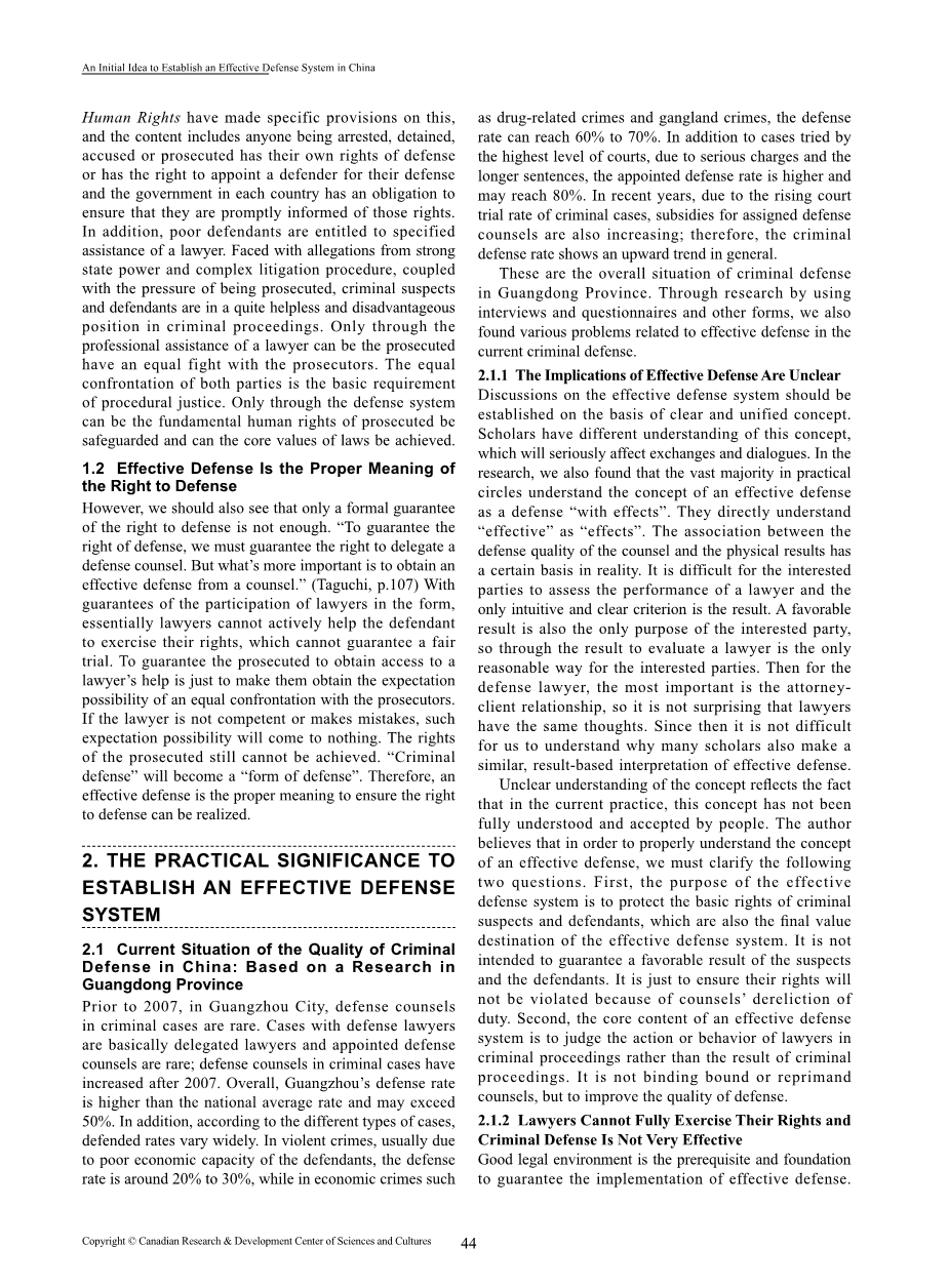 与中国相反,有效的辩护仍然是一个新问题。虽然很多学者已经讨论过这个问题,但还不是很清楚。有效的辩护是以充分行使辩护权为依据,不仅指出提高辩护素质,而且也是正义和人权保护的最终目的。不仅在理论上,实际上有效辩护的概念还没有被广泛接受,存在很多问题。另外,刑事辩护的环境是公平的,辩护率很低。辩护的质量,特别是法律援助案件的质量差,反映出对被起诉方的全面保护缺乏强度。落实犯罪嫌疑人和被告的辩护权,让他们享有合格的律师对确保公正审判具有重要意义。