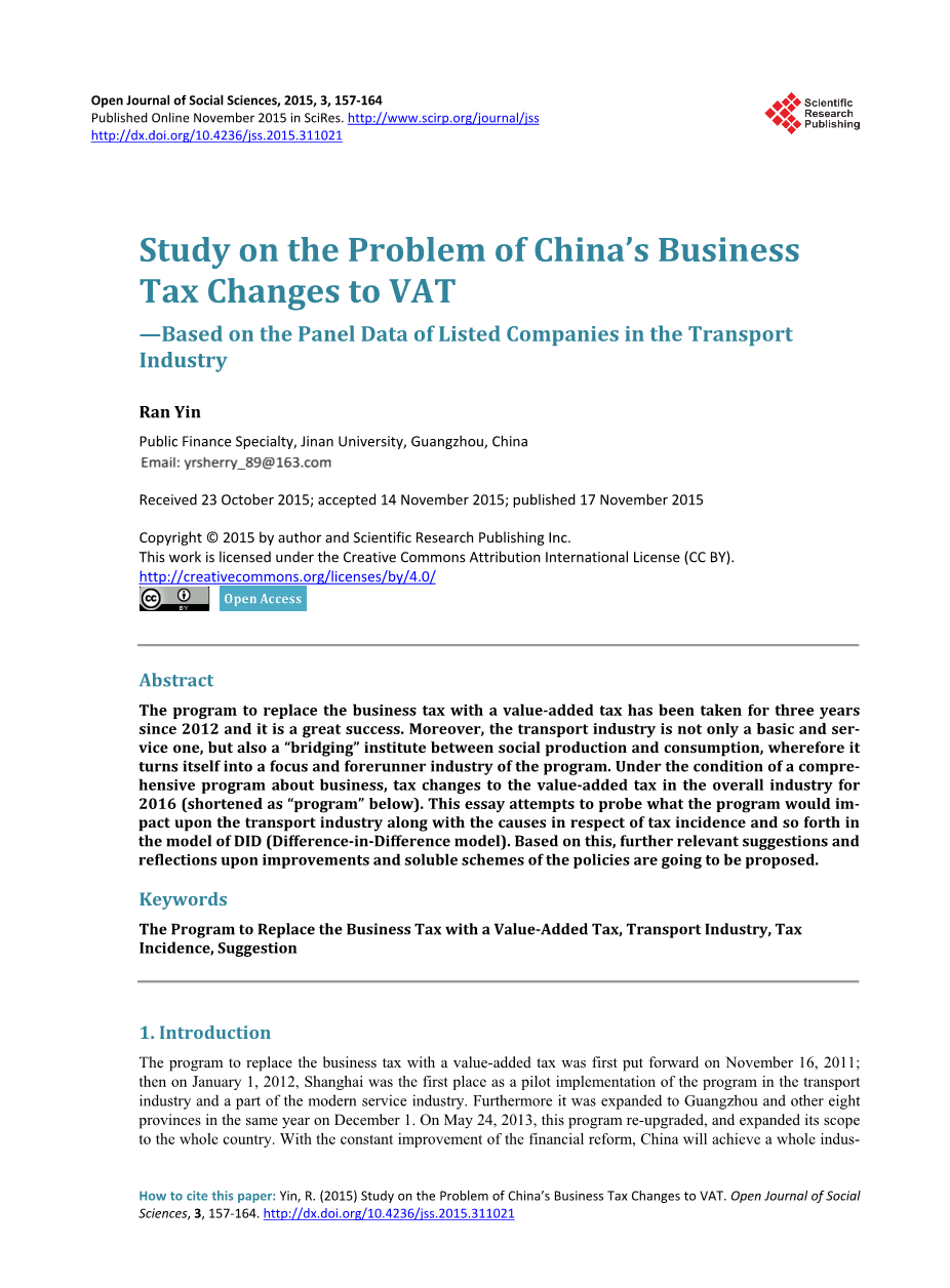 题 目 对“营改增”问题的研究——基于 交通运输业上市公司面板数据外文翻译资料