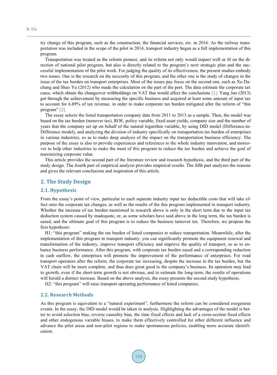 1、实验组显示,自2012年以来,由于一些地区改革政策的实施,交通运输试点地区的上市公司的负担也减少,尽管2013年交通运输行业上市公司的税务负担上升,但在2013年与正在进行的的改革试点地区作为一个整体还是低于税收增加之前的。