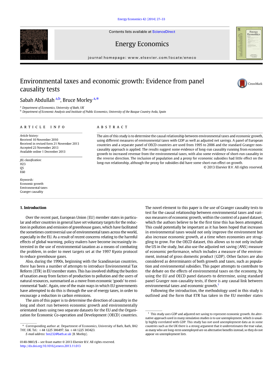 格兰杰因果关系检验被广泛用于确定一组变量之间因果关系的方向。然而,据我们所知,它们并没有被用于经济增长和环境税。正如Granger(1988)所指出的,如果一组I(1)变量之间存在协整,那么至少在一个方向上必然存在因果关系。这是因为协整的存在意味着可以形成一个误差修正模型,其中误差修正项对因变量有显著影响。然而,因果关系方法已被用于确定能源消费,能源价格和经济增长之间的因果关系(Constantini和Martini, 2010).