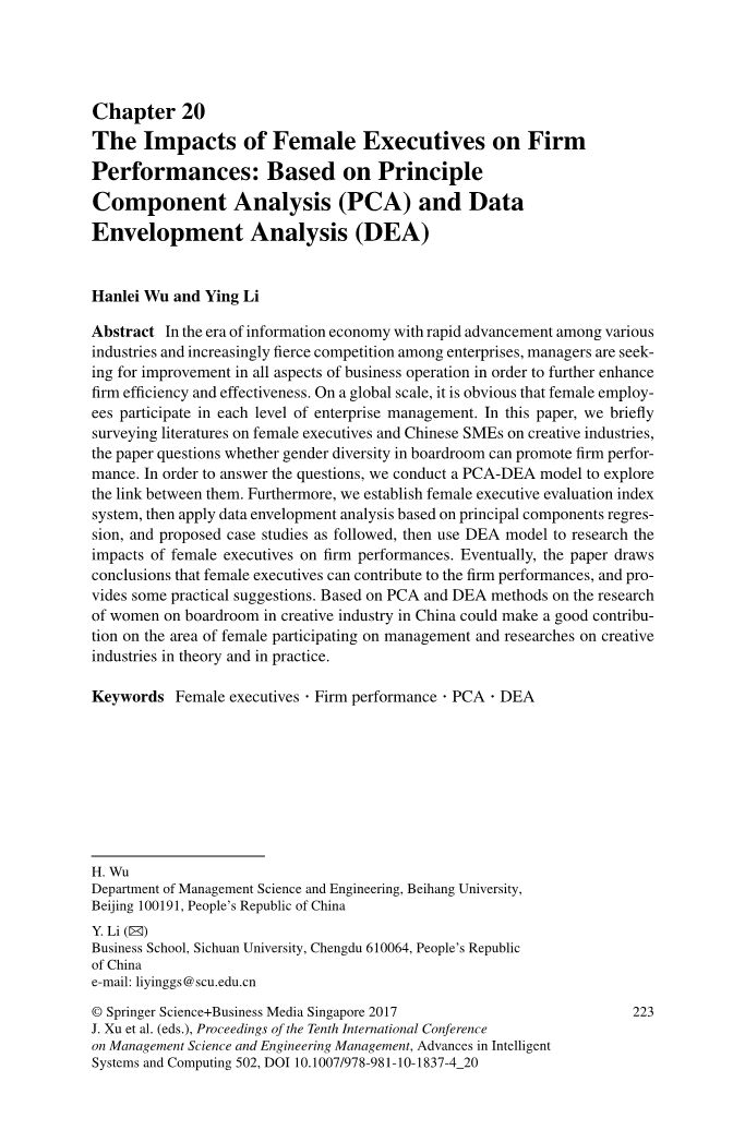 摘要:在信息经济时代,各行业快速发展,企业之间竞争日益激烈,管理者正在寻求改善企业经营的各个方面,以进一步提高企业的效率和效益。在全球范围内,女性雇员显然参与每个级别的企业管理。在本文中,我们简要介绍了关于女性高管和中国中小企业创意产业的文献,本文质疑董事会中的性别多样性是否能够促进企业绩效。为了回答这些问题,我们进行了PCA-DEA模型分析,以探索它们之间的联系。此外,我们建立了女性执行评估指标体系,然后应用基于主成分回归的数据包络分析,并提出了案例研究,然后使用DEA模型研究女性高管对公司绩效的影响。最后,本文得出结论,女性高管可以为公司绩效做出贡献,并提供一些实用的建议。基于PCA和DEA的中国创意产业女性董事会研究方法,可以在女性参与创意产业管理和研究领域做出理论和实践的有益贡献。