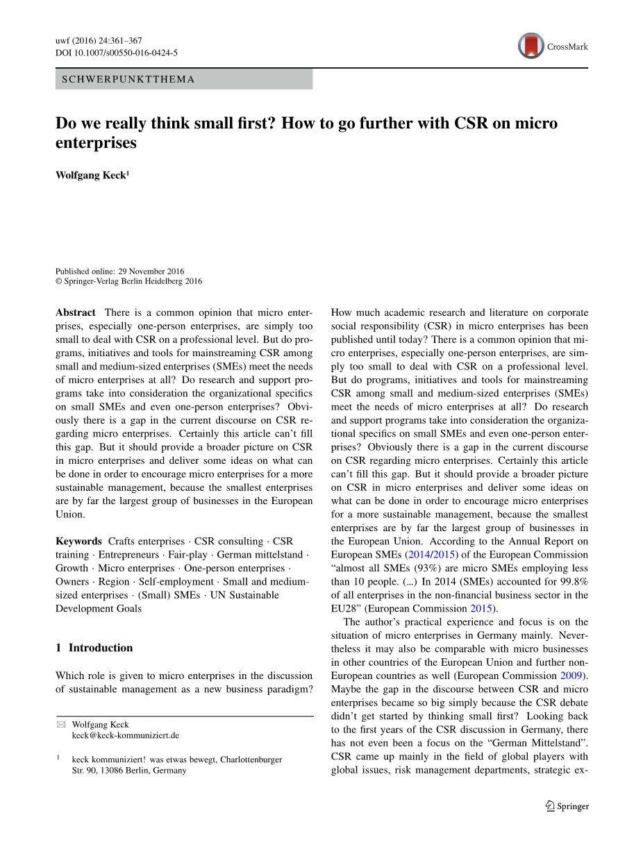 小型企业一般在社会中发挥重要作用,它们影响社区、区域、个人和环境。欧盟委员会在其发布的欧洲中小企业年度报告(2014/2015)里强调,欧盟区域内平均每平方公里之内存在5家中小企业。2014年,约三分之二的就业岗位由中小企业创造。根据Leo Hauska和Elisabeth Gail在德语系国家德国、奥地利和瑞士进行的研究,最近有近300万家一人公司,每天约有1000家新公司成立(Gail和Hauska 2017)。在此基础上,很明显,最小的公司对于工业社会中今天和将来经济表现也可能是有影响的,是负有责任的。此外,考虑到一人公司和一般微型企业更专业的企业社会责任战略,以及这些小型企业中新成立的社会和绿色企业的增加,在社会和环境领域产生积极影响的潜力可能很大(奥地利商会,2009年)。