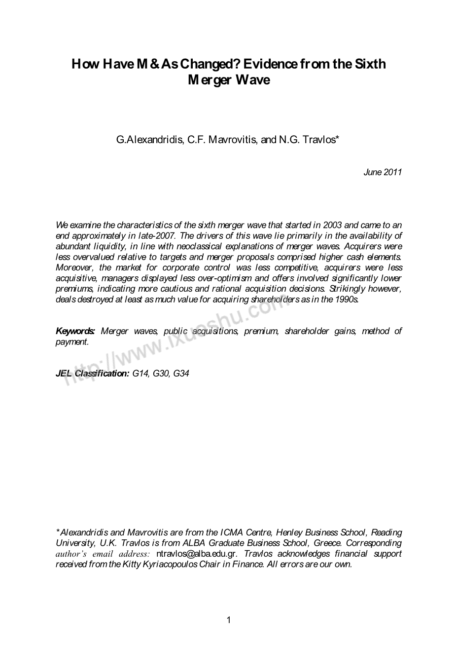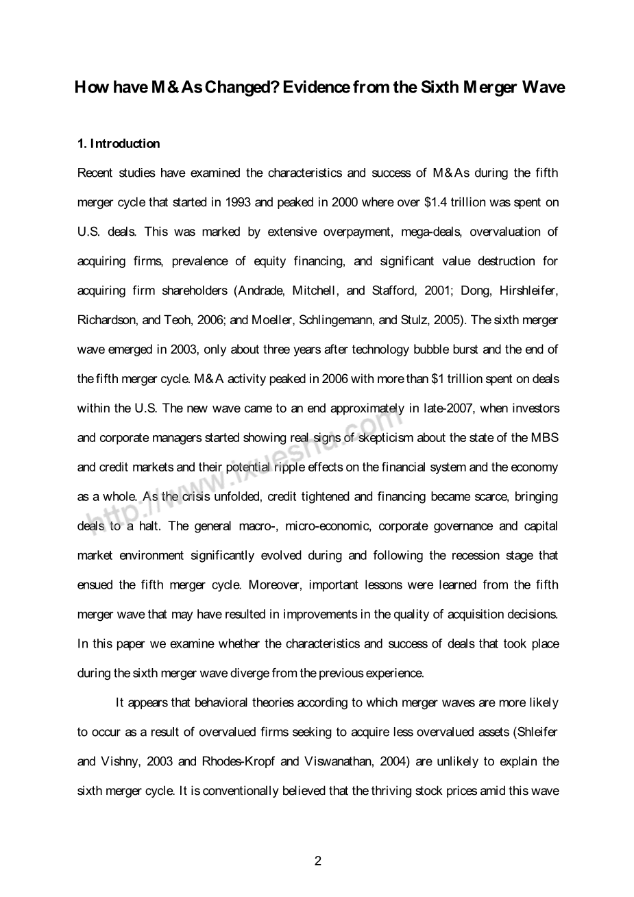 最近的研究已经检验了并购的特点和成功率,这是从1993年开始的第五个并购周期,2000年达到顶峰,当时美国的并购交易花费超过1.4万亿美元。这一点的显著特征是:巨额超额支付、巨额交易、收购公司估值过高、股权融资盛行,以及收购公司股东的重大价值损失(andrade、mitchell和stafford,2001年;dong、hirshleifer、richardson和teoh,2006年;moeller、schlingmann和stulz,2005年)。第六次合并浪潮出现在2003年,仅在技术泡沫破灭和第五次合并周期结束三年之后。并购活动在2006年达到顶峰,在美国境内投资超过1万亿美元。新浪潮大约在2007年底结束,当时投资者和企业管理者开始对市场抵押贷款和信贷市场的状况及其对金融体系和经济的潜在连锁反应表现出怀疑的真正迹象,这是一种对金融体系和经济的巨大影响。好啊。随着危机的展开,信贷紧缩和融资变得稀缺,导致交易停止。总体宏观、微观经济、公司治理和资本市场环境在第五个并购周期之后的衰退阶段和之后发生了显著变化。此外,第五轮并购浪潮也吸取了重要的教训,这可能导致收购决策质量的提高。本文考察了第六次并购浪潮中交易的特点和成功与以往的经验是否存在差异。