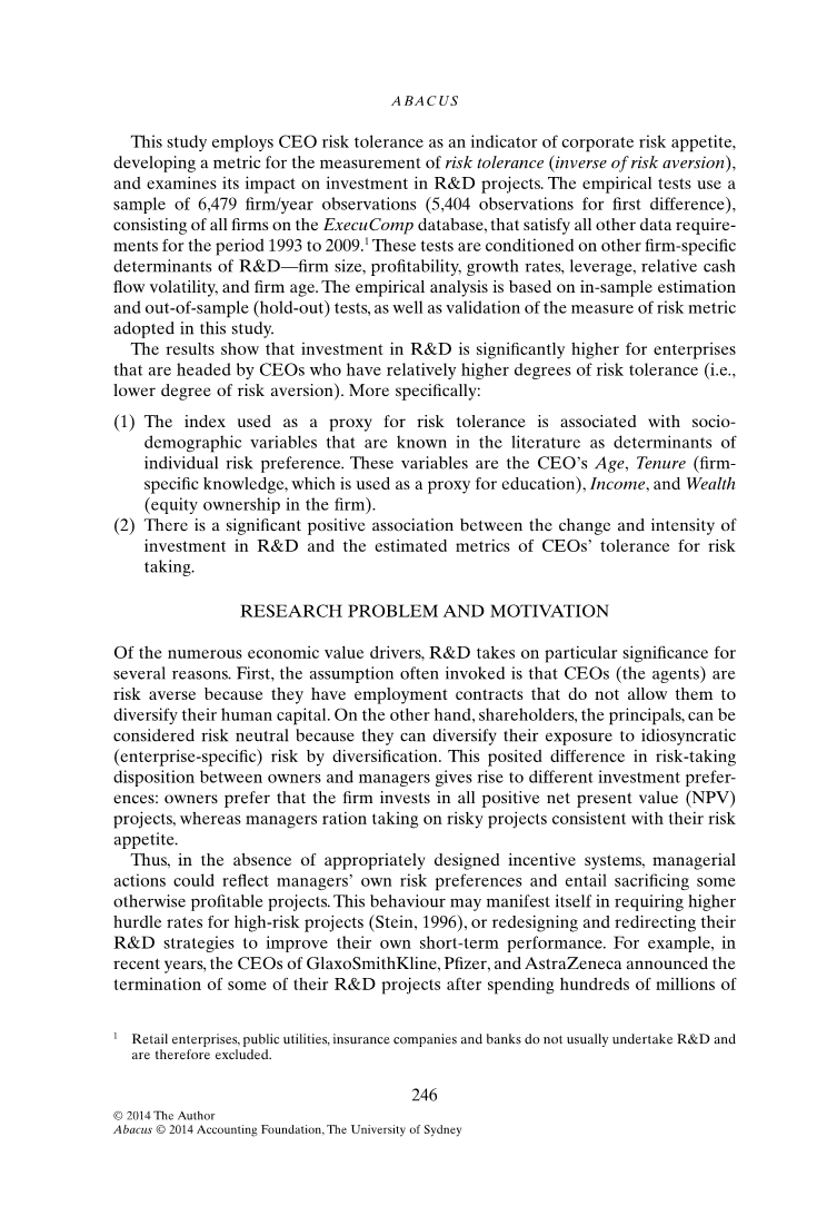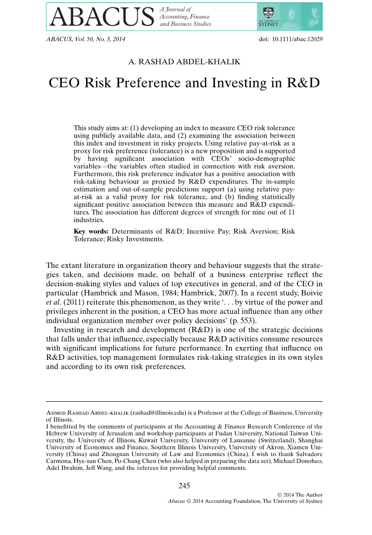 AR Abdel-Khalik. CEO Risk Preference and Investing in Ramp;D [J]. Abacus A Journal of Accounting Finance amp; Business Studies, 2014, 50(3): 245–278