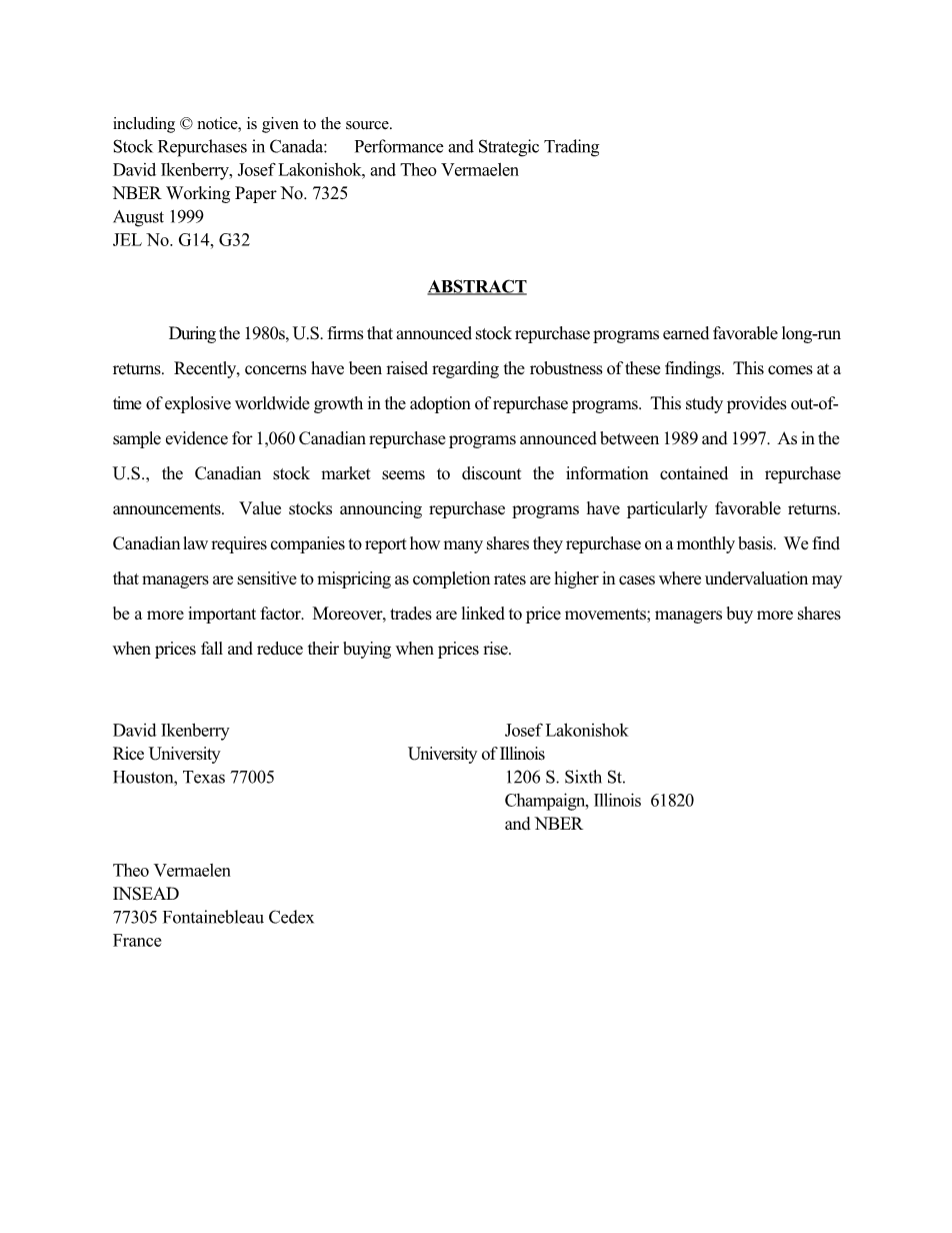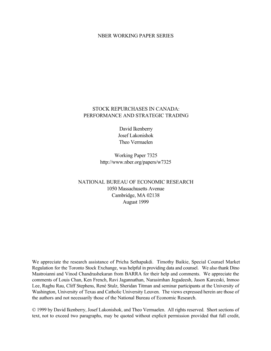 鉴于近期全球回购活动的增长,长期以来的新证据回购公司的业绩令人感兴趣。虽然许多国家现在允许回购,然而美国之外的国家唯一一个合理的样本在加拿大。因此,我们研究开放市场项目公司宣布的交易在多伦多证交所(TSE)。。而且,我们利用1989年至1997年期间宣布的方案,这个时间段通常遵循样本在美国早期研究中进行了研究。我们的样品是全面的,包含1,060程序公告授权350亿美元的回购。这个分析补充了发行股票后的长期股票业绩的证据。具体地说,我们认为加拿大人有经验丰富的股票发行和收购,至少部分由股权融资。结果公布后股票表现回落会下滑增加流通股