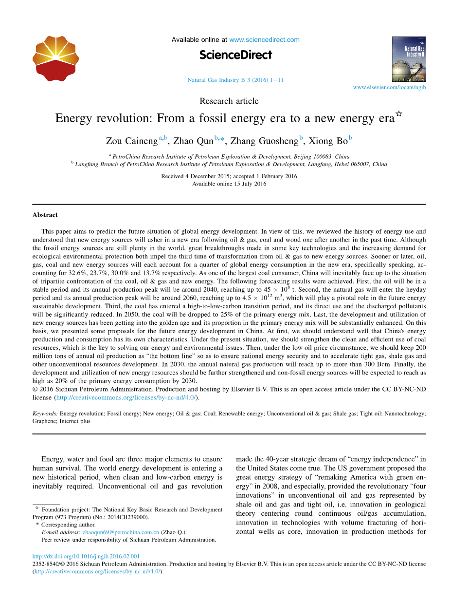 关键词:能源革命;化石能源;新能源;石油天然气;煤;可再生能源;非常规油气;页岩气;致密油;纳米技术;石墨烯;互联网