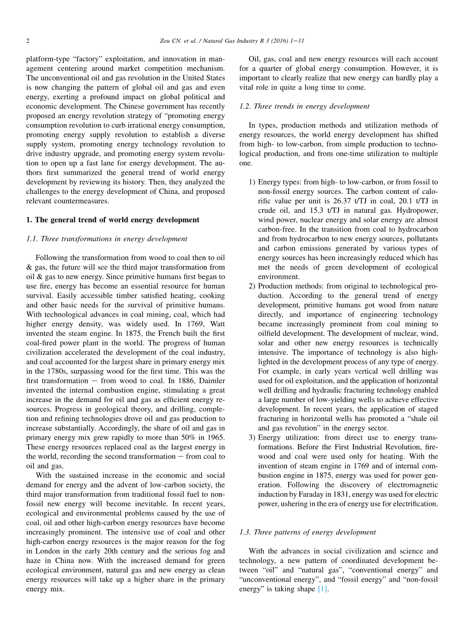 能源、水和食物是确保人类生存的三大要素。世界能源发展正进入一个新的历史时期,清洁能源和低碳能源势在必行。非常规油气使美国40年的“能源独立”战略梦想成真。2008,美国政府提出了“以绿色改造美国”的大能源战略,特别是以页岩油气和致密油为代表的非常规油气的革命“四个创新”,即以地质理论为中心的创新、圆形连续油气藏、以威尔斯为核心的体积压裂技术创新、生产方法创新。美国非常规油气革命正在改变全球石油和天然气甚至能源的格局,对全球政治和经济发展产生深远影响。中国政府最近提出了“推进能源消费革命,遏制不合理能源消费,促进能源供应革命,建立多元化供应体系,推动能源技术革命,带动产业升级”的能源革命战略。推进能源系统革命,为能源发展开辟一条快车道。本文首先回顾了世界能源发展的总体趋势和世界能源发展的历史。然后分析了中国能源发展面临的挑战,并提出了相应的对策。