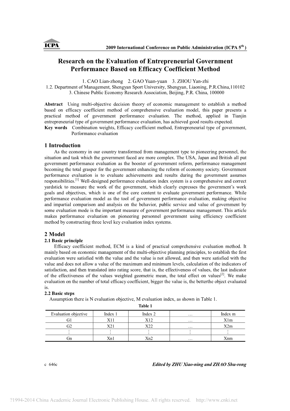 关键词:组合权重、功效系数法、企业家型政府、绩效评价