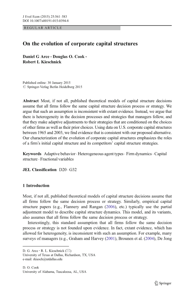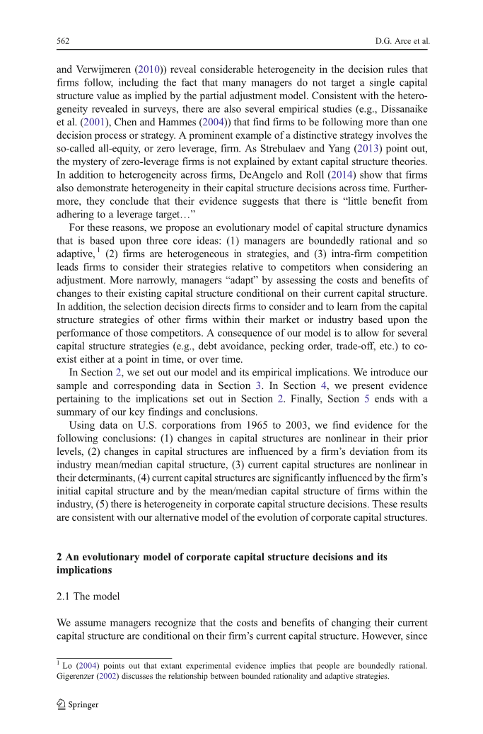 基于这些原因,我们提出了一个资本结构动态演化模型。这是基于三个核心思想:(1)管理者是有限度的理性的。适应性强,1(2)企业在战略上具有异质性,(3)企业内部竞争。导致企业在考虑竞争对手时考虑其战略。调整。更狭义的是,管理人员通过评估其现有资本结构的变化取决于其目前的资本结构。此外,选择决定还指导企业考虑并向资本学习。市场或行业内其他公司的结构战略竞争对手的表现。我们的模型的一个结果是允许资本结构战略(例如,债务规避、优先次序、权衡等)共存无论是在某一时间点,还是在一段时间内。