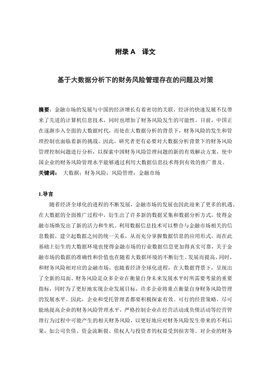 With the development process of economic globalization, the development of financial market has also ushered in more opportunities. In the process of comprehensive promotion of big data, there are many new forms of data acquisition and analysis, which make the financial market glow with new vitality. Data information technology integrates the information data related to the financial market, and establishes a unified relationship between the data, so as to fully grasp the application form of data information. On this basis, the derived big data environment makes the industry data information of the financial market more authentic and reliable, and the accuracy and value of the data are also improving day by day. And financial risks corresponding to the development of the financial market also have a new situation under the background of big data. Financial risk is an important indicator for enterprises to measure their own future development level. In order to better achieve the development goals, many enterprises will focus on measuring the development level of their own financial risk management. Therefore, it is necessary to actively explore effective strategies to effectively improve the level of financial risk management, and strictly control financial risks, so as to better deal with the adverse consequences brought by financial risks. The management and control of financial risks can not only help to build a harmonious and stable development environment for Chinas economic development, but also provide an environmental basis for the sustainable development of the economic level. It can also ensure that Chinas economic entities are free from the interference of external environment in financial risks, ensure the safety level of economic entities in financial risks, and minimize the level of economic benefits of enterprises caused by financial risks.