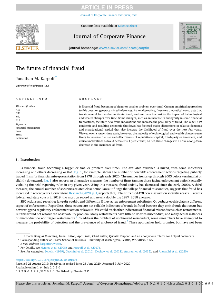 随着时间的推移,财务欺诈是成为一个更大的问题还是一个更小的问题?目前对这个问题的经验方法产生了混合的推论。作为一种替代方法,我使用了两种理论结构,分离出了导致欺诈的几个因素,并使用它们来考虑技术和财富随时间变化的影响。一些变化,如在某些金融交易中增加匿名性,促进了新的欺诈创新,增加了欺诈的可能性。COVID-19病毒的流行以及由此导致的经济停滞不前,导致了相对需求和组织资本的严重中断,这也增加了未来几年欺诈的可能性。然而,从更长的时间尺度来看,大多数技术和财富变化似乎有可能增加声誉资本、第三方执法和道德动机作为欺诈威慑的使用和有效性。我预测,在网上,这些变化将推动欺诈发生率的长期下降。