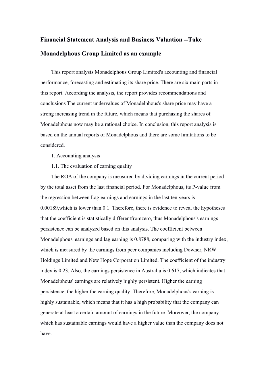 This report analysis Monadelphous Group Limiteds accounting and financial performance, forecasting and estimating its share price. There are six main parts in this report. According the analysis, the report provides recommendations and conclusions The current undervalues of Monadelphouss share price may have a strong increasing trend in the future, which means that purchasing the shares of Monadelphous now may be a rational choice. In conclusion, this report analysis is based on the annual reports of Monadelphous and there are some limitations to be considered.