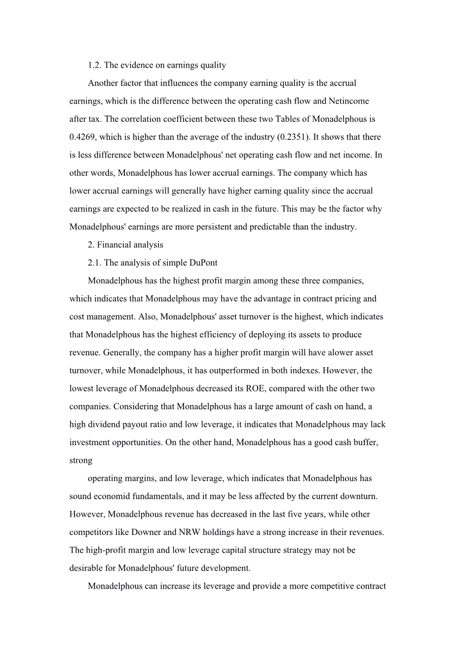 The ROA of the company is measured by dividing earnings in the current period by the total asset from the last financial period. For Monadelphous, its P-value from the regression between Lag earnings and earnings in the last ten years is 0.00189,which is lower than 0.1. Therefore, there is evidence to reveal the hypotheses that the coefficient is statistically differentfromzero, thus Monadelphouss earnings persistence can be analyzed based on this analysis. The coefficient between Monadelphous earnings and lag earning is 0.8788, comparing with the industry index, which is measured by the earnings from peer companies including Downer, NRW Holdings Limited and New Hope Corporation Limited. The coefficient of the industry index is 0.23. Also, the earnings persistence in Australia is 0.617, which indicates that Monadelphous earnings are relatively highly persistent. Higher the earning persistence, the higher the earning quality. Therefore, Monadelphouss earning is highly sustainable, which means that it has a high probability that the company can generate at least a certain amount of earnings in the future. Moreover, the company which has sustainable earnings would have a higher value than the company does not have.