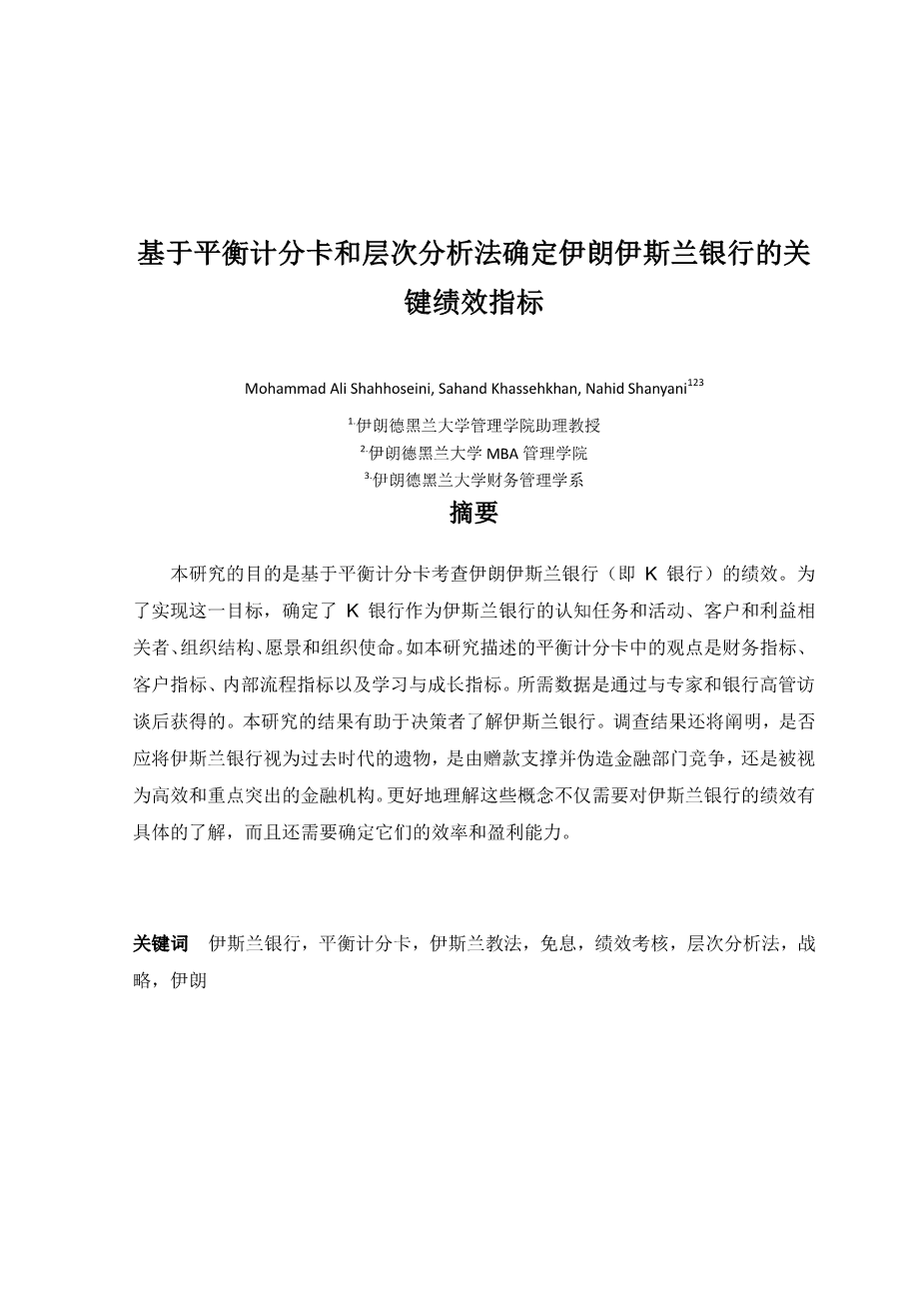 基于平衡计分卡和层次分析法确定伊朗伊斯兰银行的关键绩效指标外文翻译资料 2023-08-28 17:03:18 英语原文共 10 页,剩余内容已隐藏,支付完成后下载完整资料 英语译文共 13 页,剩余内容已隐藏,支付完成后下载完整资料 资料编号:[607619],资料为PDF文档或Word文档,PDF文档可免费转换为Word 您需要先支付 30元 才能查看全部内容!立即支付 发小红书推广免费获取该资料资格。点击链接进入获取推广文案即可: Ai一键组稿 | 降AI率 | 降重复率 | 论文一键排版 PREVIOUS NEXT 您可能感兴趣的文章 基于Hedonic模型的地铁沿线房地产价格影响因素分析–以苏州地铁2号线沿线为例开题报告 江苏省上市公司经济增加值测算与结果分析开题报告 互联网对公司财务管理的影响—–以青岛海尔集团为例开题报告 产权性质、研发投入与企业绩效–基于信息技术企业的实证分析文献综述 女性管理者对碳信息披露水平的影响文献综述 基于COSO内部控制框架的我国制造业上市公司企业信息披露现状评价开题报告 内部控制与企业价值增长文献综述 我国分行业经济增加值测算与结果分析开题报告 盈余管理与投资效率的相关性研究——以新能源行业上市公司为例开题报告 外商投资对江苏省上市公司职工收入的影响开题报告