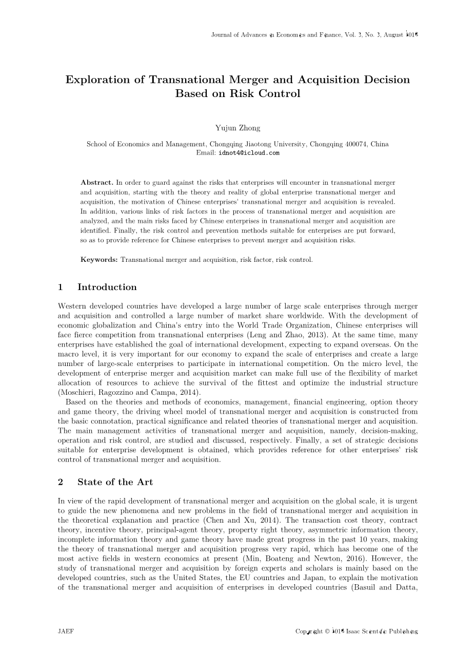 摘要。 为了防范企业在跨国并购中会遇到的风险,从全球企业跨国并购的理论和现实出发,揭示了中国企业跨国并购的动机。 此外,还分析了跨国并购过程中风险因素的各个环节,确定了我国企业在跨国并购中面临的主要风险。 最后,提出适合企业的风险控制和防范方法,为我国企业防范并购风险提供参考..