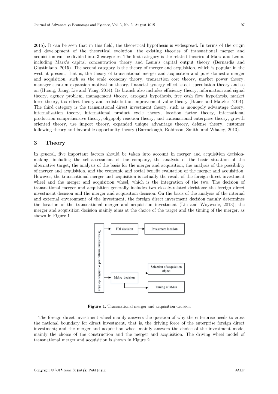 2015)。 可以看出,在这一领域,理论假设是广泛的。 从理论演变的起源和发展来看,现有的跨国并购理论可分为3类。 第一类是马克思列宁主义的相关理论,包括马克思的资本集中理论和列宁的资本产出理论(Bernardis和Giustiniano,2015).. 第二类是目前西方流行的并购理论,即规模经济理论、交易成本理论、市场力量理论、经理层扩张动机理论、金融协同效应、炒股理论等跨国并购理论和纯国内并购理论(黄、江、李、杨,2014)。 其分支还包括效率理论,信息与信号理论,代理问题,管理理论,傲慢假设,自由现金流假设,市场力量理论,税收效应理论和再分配改进价值理论(Bauer和Matzler,2014).. 第三类是跨国直接投资理论,如垄断优势理论,内化理论,国际产品周期理论,区位因素理论,国际生产综合理论,寡头垄断反应理论,以及跨国企业理论,增长导向理论,运用进口理论,扩大独特优势理论,防御理论,顾客跟随理论和有利机会理论(Barraclough,Robinson,Smith,Whaley,2013)..