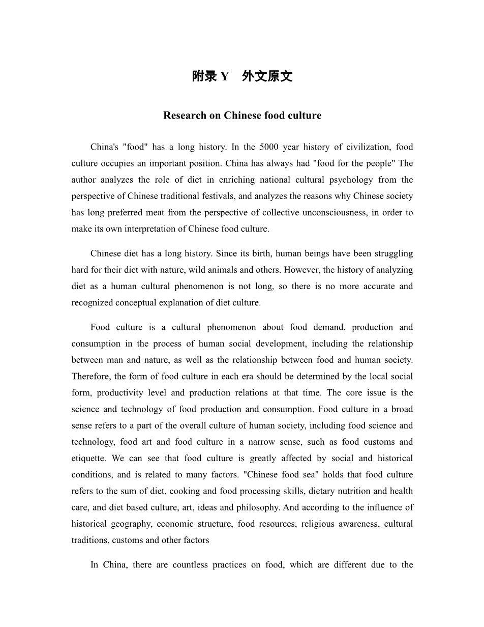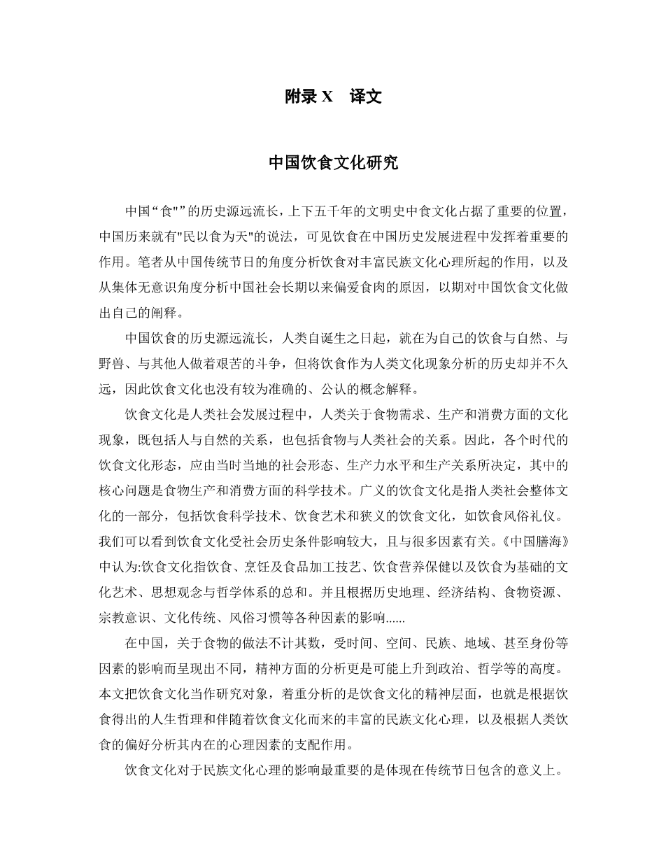 中国饮食文化研究外文翻译资料 2023-06-25 09:41:16 英语原文共 3 页,剩余内容已隐藏,支付完成后下载完整资料 英语译文共 6 页,剩余内容已隐藏,支付完成后下载完整资料 资料编号:[603559],资料为PDF文档或Word文档,PDF文档可免费转换为Word 您需要先支付 30元 才能查看全部内容!立即支付 发小红书推广免费获取该资料资格。点击链接进入获取推广文案即可: Ai一键组稿 | 降AI率 | 降重复率 | 论文一键排版 PREVIOUS NEXT 您可能感兴趣的文章 新型城镇化视角下基层社会治理模式研究文献综述 基于SWOT分析的民营企业朴素式创新研究文献综述 城市社区居家养老需求影响因素研究——以南京市为例文献综述 中国煤炭利用生态效率评价及提升对策开题报告 社区融合度及其影响因素研究——以姜堰三水四大社区为例开题报告 不确定条件下人员疏散路径选择决策行为模型研究文献综述 价值工程在饭店成本控制中的应用以某中等城市经济型饭店为例外文翻译资料 管理前厅部:马来西亚酒店的人员配置问题外文翻译资料 影响酒店运维成本的因素外文翻译资料 在马来西亚巴生谷地区,酒店员工满意度和忠诚度的联系外文翻译资料