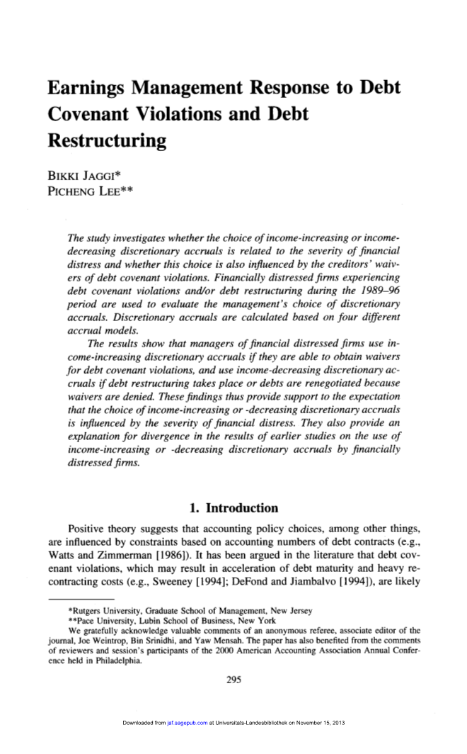 这项研究调查了收入增加或收入减少的操控性应计利润的选择是否与财务困境的严重程度有关,以及这一选择是否也受到债权人违反债务契约行为的影响。在1989-1996期间经历债务契约违规和/或债务重组的财务困境公司被用来评估管理层对操控性应计利润应计项目的选择。操控性应计利润是根据四种不同的应计模型计算的。