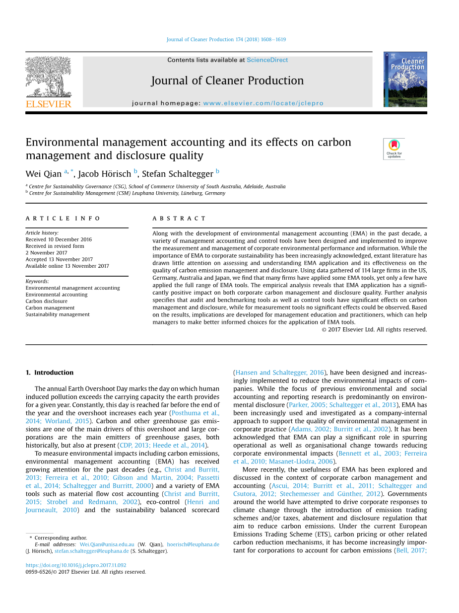 最近,在公司碳管理和碳核算的背景下,对EMA的效用进行了探讨和分析。(Ascui, 2014; Burritt et al., 2011; Schaltegger and Csutora, 2012; Stechemesser and Guuml;nther, 2012)。世界各国政府试图通过采用旨在减少碳排放的排放交易计划或税收、减排和披露条例来推动企业应对气候变化。目前欧洲在排放量交易计划(ETS)、碳定价或其他相关的碳减排机制下,碳排放量的核算对公司而言已变得越来越重要(Bell, 2017;Bowen and Wittneben, 2011; Engels, 2009; King, 2014; Qian and Schaltegger, 2017)。人们期望减少企业碳排放的第一步是提高透明度,并披露此类排放。这项期望导致建立了碳披露项目(CDP)等融资机制。CDP机制收集并且公布了世界上最大的一些公司对温室气体排放的(自愿)披露。