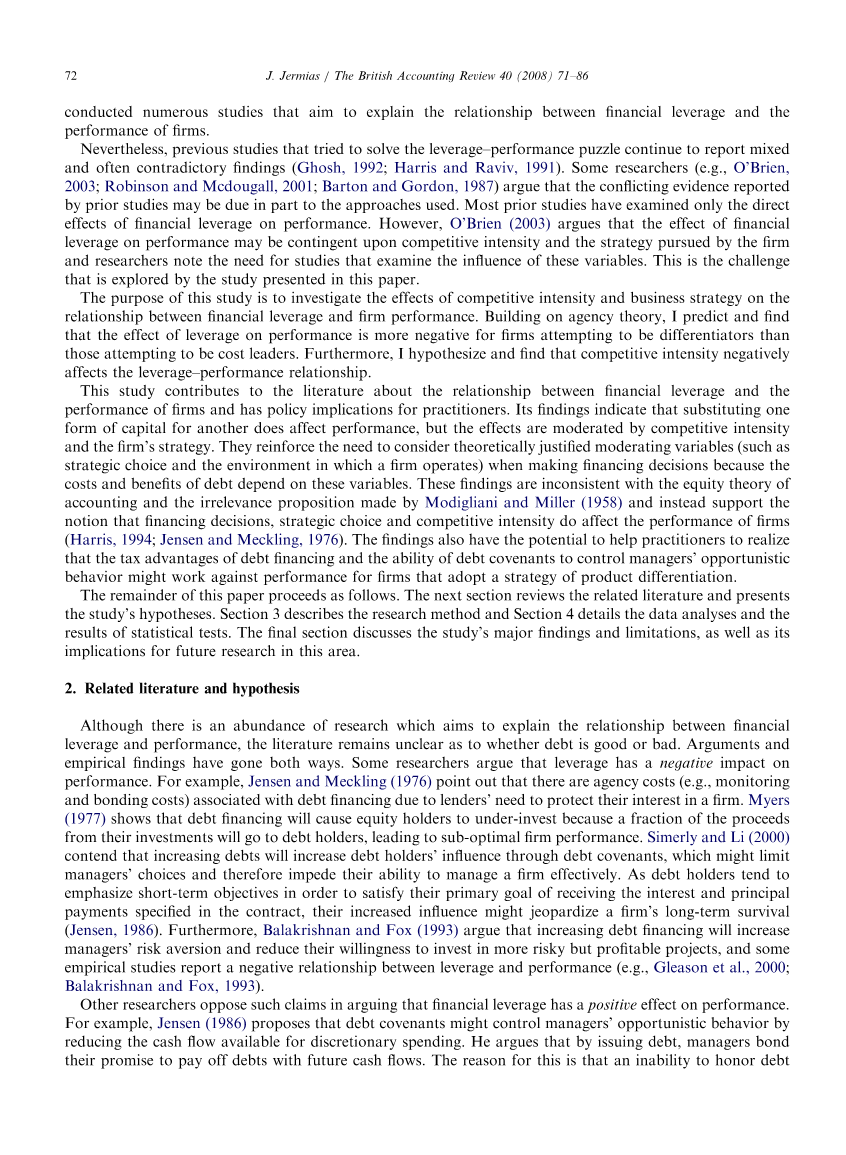 先前关于财务杠杆和绩效之间关系的研究结果不一致,部分原因可能是研究人员的方法。大多数进行这些研究的研究人员采用了普遍的方法,研究了财务杠杆对绩效的直接或主要影响。O brian(2003)指出,这些先前的研究忽略了公司商业战略的影响,并认为这可能解释了它们相互矛盾的结果。