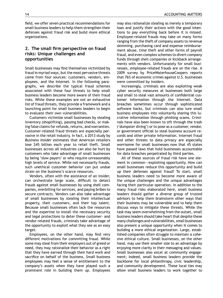 所有这些欺诈风险来源都有一个共同点 - 利用机会。小型企业如何减少这种机会并建立抵御欺诈的防御措施?首先,小型企业领导者需要更加关注其特定运营所面临的独特挑战和独特优势。除了这里详细阐述的许多欺诈风险之外,小企业领导者还应该聚集各种各样可信赖的顾问,帮助他们集体讨论其业务可能受到影响的其他方式,并帮助他们讨论缓解这些威胁的方法。虽然这项任务从一开始似乎势不可挡,但小企业领导者应该认真对待,尽管存在诸多挑战和薄弱环节,但小企业在建立一个更加道德的组织方面也提供了一个独特的机会。大型公司经常努力维护一个统一的道德文化。另一方面,小型企业可以通过在消息传递和价值方面更加清晰地利用其较小的规模来获得优势。小企业也擅长社区参与;事实上,小企业领导者为地方慈善事业,公民领导力和社区发展提供了支柱。这些地方联系可能允许小型企业领导人一起工作,以扩大对欺诈威胁的认识,并开发创新方法来减少欺诈风险。小企业也因其密切的个人业务关系而与大企业有所区别。小企业主经常利用家人和朋友来资助,员工和企业成长,虽然这些关系可能带来他们自己的道德挑战,但他们也给小企业主与其大竞争对手的“信任优势”。