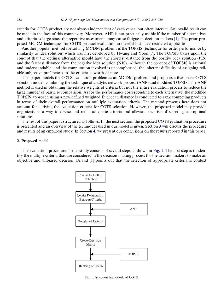 本文将COTS评估问题作为一个MCDM多目标决策问题来建立模型,并提出了一个分五阶段的COTS选择模型,结合了ANP法(网络层次分析法)和改进型的TOPSIS法(通过对特征表现与其理想解的接近程度进行排序的技术方法)。ANP法来确定多元评价标准的相对权重但不是一个整体的评价过程以此来减少大量的两两比较。作为对于每个选择所对应的各自表现,改进型的TOPSIS法运用一个新定义的权重化的欧氏距离,结合产品在多评价标准上的全局表现,对产品进行排名。该方法此处所呈现的不能算作对于COTS选择法所推导得到的评价标准。然而,此处提出的模型可提供一种组织方法来设计以及重新定义适当的标准以及减少选择次优解决方案时的风险。