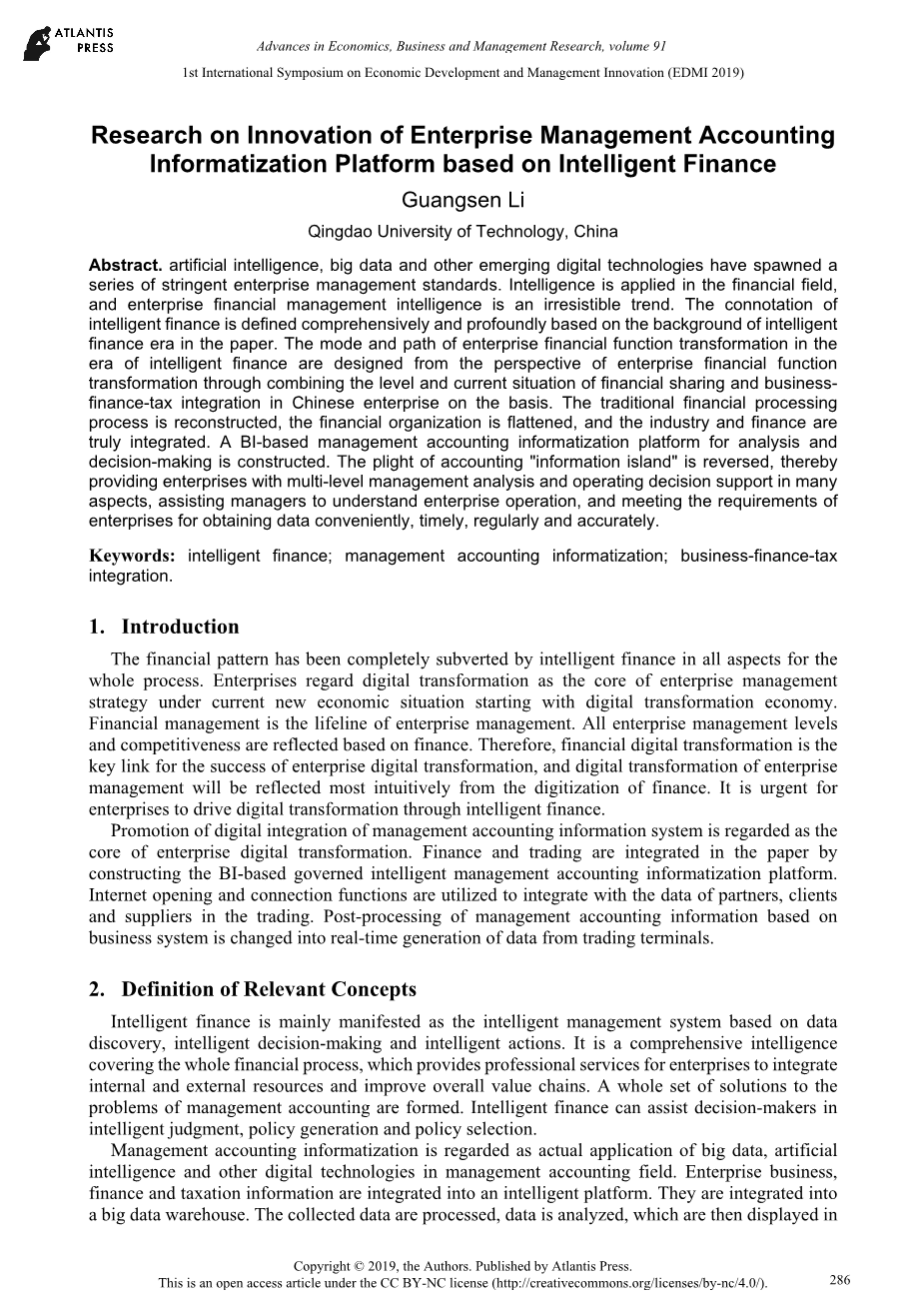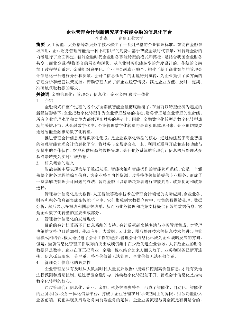 企业管理会计创新研究基于智能金融的信息化平台外文翻译资料 2023-02-12 12:24:47 英语原文共 6 页,剩余内容已隐藏,支付完成后下载完整资料 英语译文共 5 页,剩余内容已隐藏,支付完成后下载完整资料 资料编号:[235505],资料为PDF文档或Word文档,PDF文档可免费转换为Word 您需要先支付 30元 才能查看全部内容!立即支付 发小红书推广免费获取该资料资格。点击链接进入获取推广文案即可: Ai一键组稿 | 降AI率 | 降重复率 | 论文一键排版 PREVIOUS NEXT 您可能感兴趣的文章 互联网背景下制造业上市公司业绩评价分析开题报告 互联网专车行业商业模式对收入确认的影响分析文献综述 自然资源资产审计方法与应用实务研究文献综述 会计信息披露质量对投资回报的影响研究——针对房地产行业文献综述 资本结构对企业盈利能力影响研究,以万科集团为例文献综述 我国企业社会责任信息披露对资本成本的影响研究文献综述 公司治理与高管薪酬的实证研究——来自金融业上市公司的经验证据文献综述 上市公司人力资源信息披露与企业价值研究文献综述 环境规制、技术创新与企业绩效:来自于制造业上市公司的证据文献综述 市场条件下工业企业环境绩效与财务绩效关系研究开题报告