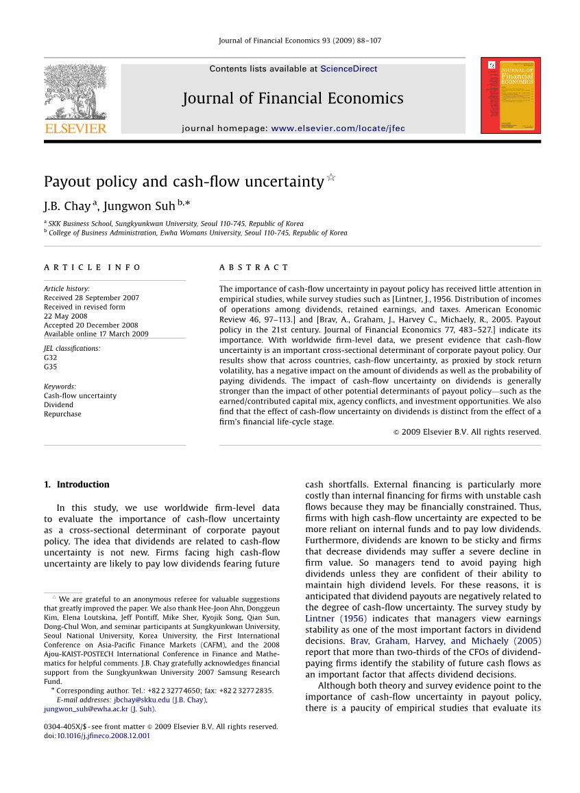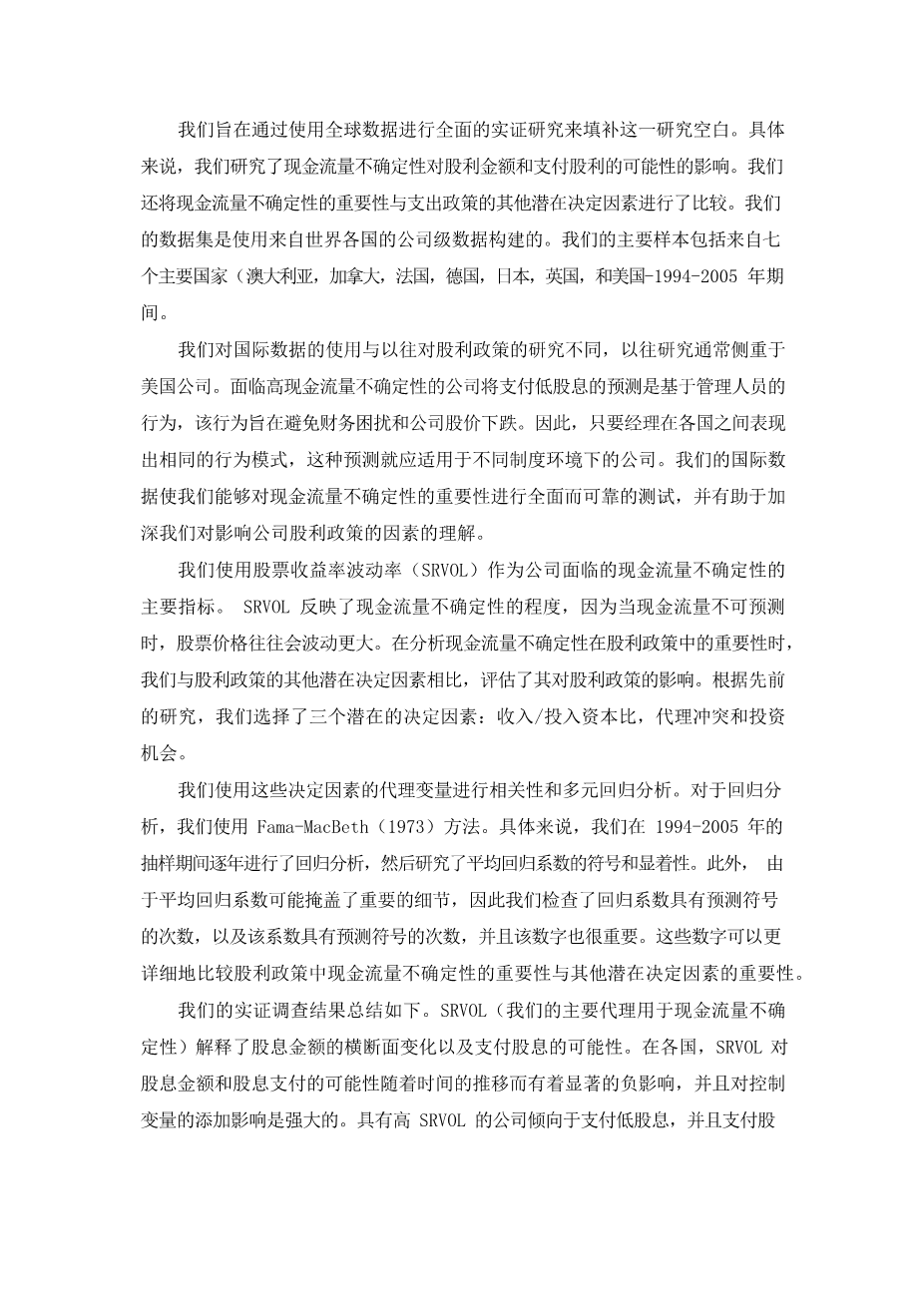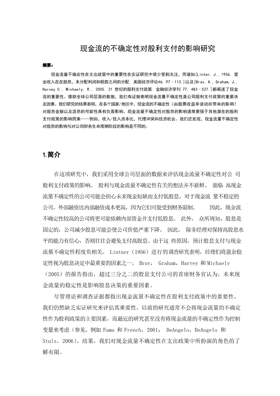 现金流的不确定性对股利支付的影响研究外文翻译资料 2023-02-19 20:14:01 英语原文共 20 页,剩余内容已隐藏,支付完成后下载完整资料 英语译文共 30 页,剩余内容已隐藏,支付完成后下载完整资料 资料编号:[257747],资料为PDF文档或Word文档,PDF文档可免费转换为Word 您需要先支付 30元 才能查看全部内容!立即支付 发小红书推广免费获取该资料资格。点击链接进入获取推广文案即可: Ai一键组稿 | 降AI率 | 降重复率 | 论文一键排版 PREVIOUS NEXT 您可能感兴趣的文章 互联网背景下制造业上市公司业绩评价分析开题报告 互联网专车行业商业模式对收入确认的影响分析文献综述 自然资源资产审计方法与应用实务研究文献综述 会计信息披露质量对投资回报的影响研究——针对房地产行业文献综述 资本结构对企业盈利能力影响研究,以万科集团为例文献综述 我国企业社会责任信息披露对资本成本的影响研究文献综述 公司治理与高管薪酬的实证研究——来自金融业上市公司的经验证据文献综述 上市公司人力资源信息披露与企业价值研究文献综述 环境规制、技术创新与企业绩效:来自于制造业上市公司的证据文献综述 市场条件下工业企业环境绩效与财务绩效关系研究开题报告